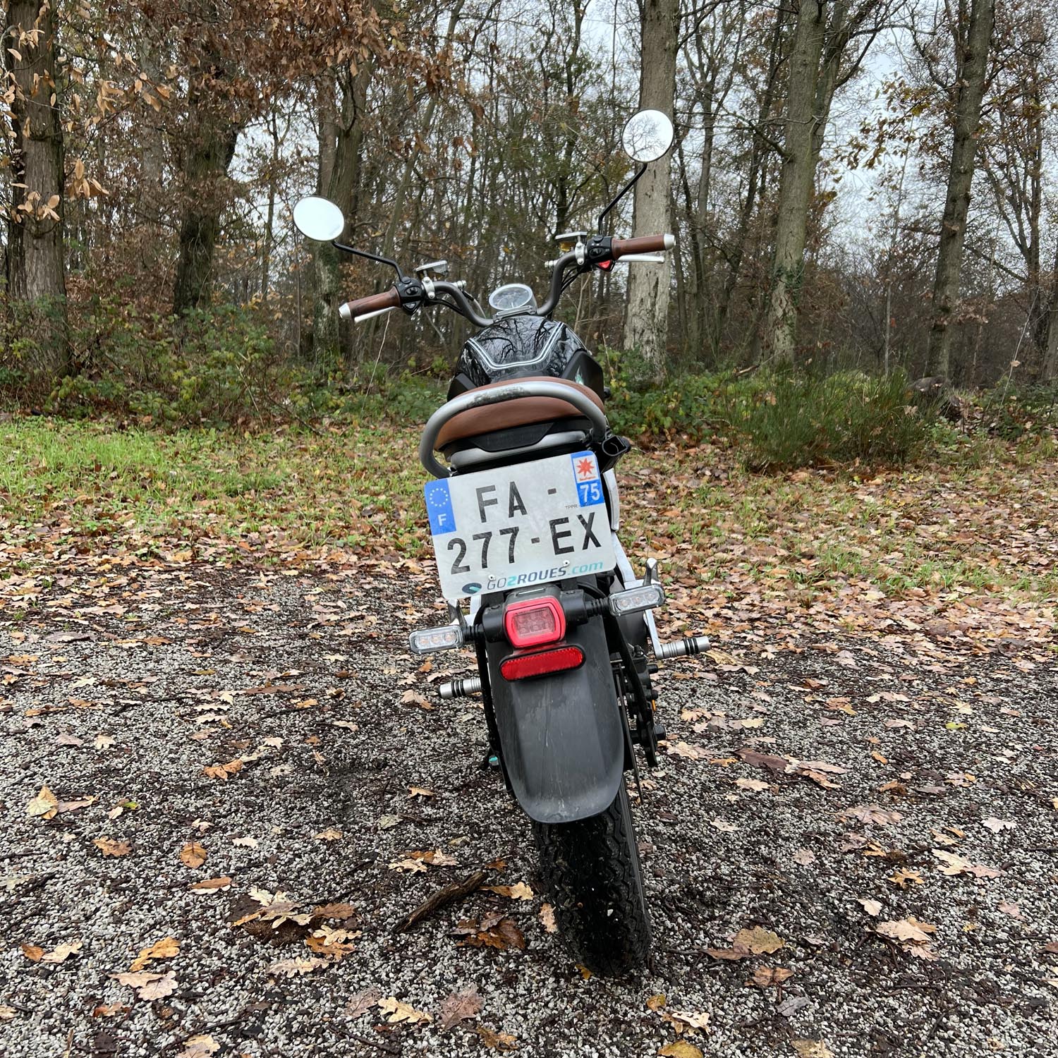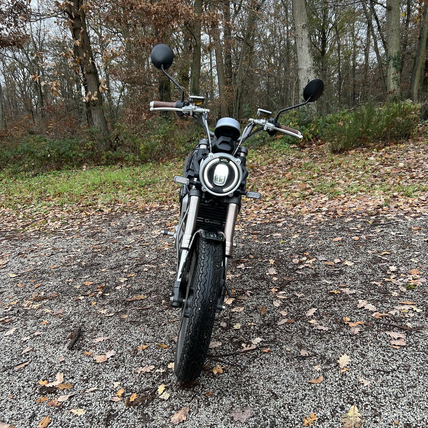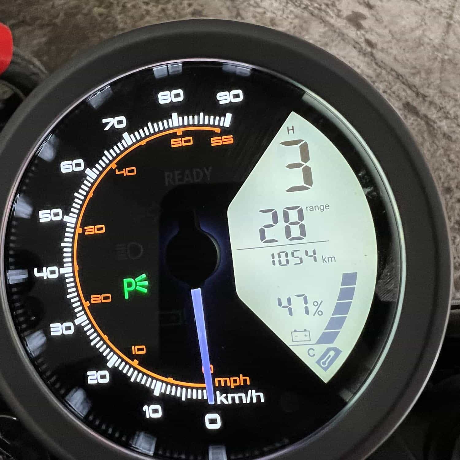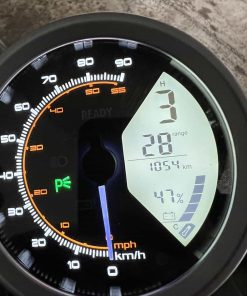 L’intégralité de l’éclairage de la Super Soco TC est à LED. Le phare avant est un modèle du genre : la nuit venue, il éclaire extrêmement bien. Le compteur est également très bon : vintage, rond, il contient une partie analogique et une partie numérique. Cette dernière comporte l’odomètre, l’état de charge de la batterie, la température extérieure, et l’autonomie restante estimée. On y trouve également le mode de conduite sélectionné. La partie analogique comporte la vitesse instantanée, à aiguille. Le démarrage de la Super Soco TC est keyless. Elle détecte la proximité de la télécommande. Pour démarrer le véhicule, il suffit d’appuyer sur le bouton Start. Enfin, il existe trois modes de conduite selon que vous privilégiez la puissance ou l’autonomie. On regrette l’absence d’un port USB. La TC ne dispose pas de l’application Super Soco.