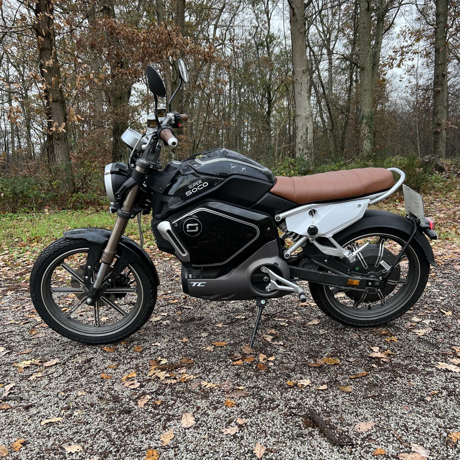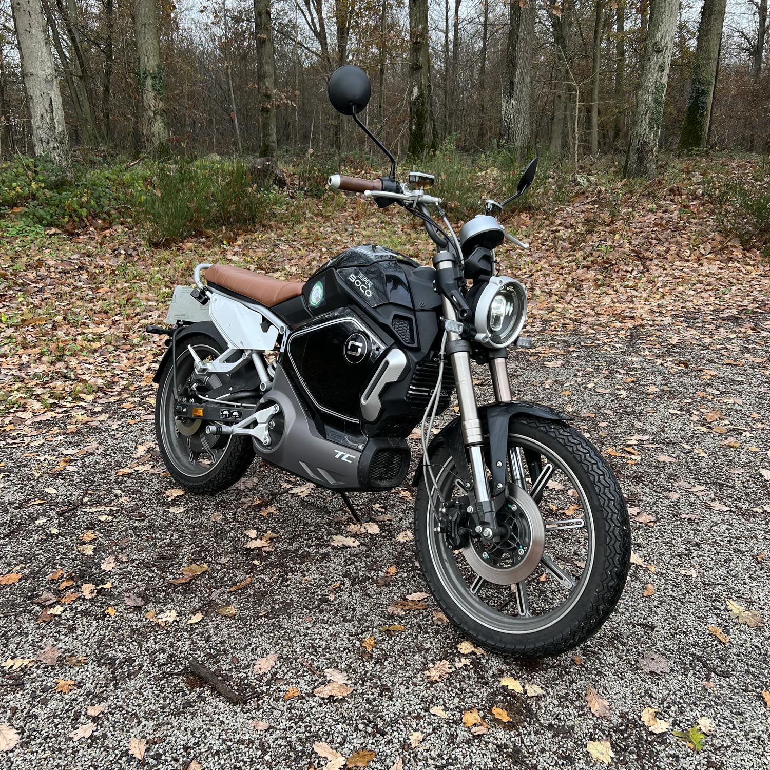 La fourche de la Super Soco TC est inversée et hydraulique. Elle mesure 35 mm. L’amortisseur arrière est à ressort et réglable en précharge. À bord, le confort est bon. Elle est homologuée deux places : la TC dispose de repose-pied passager et d’une poignée de maintien, à l’arrière de la selle. Toutefois, la selle étant relativement courte, on ne pourra voyager à deux que si les gabarits du pilote et de son passager sont faibles.