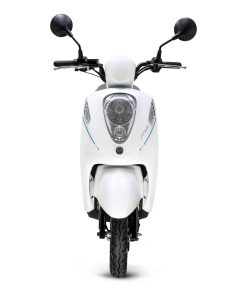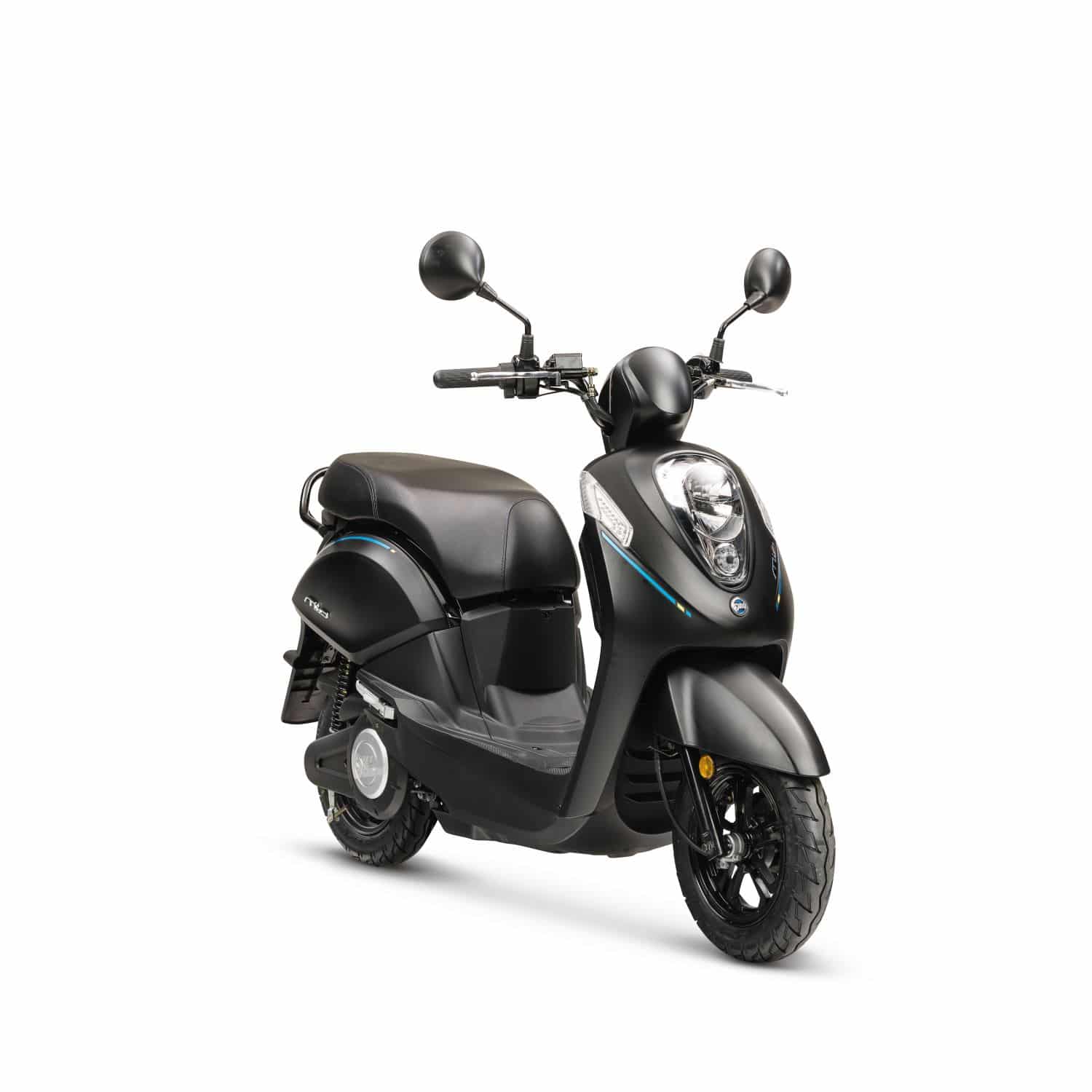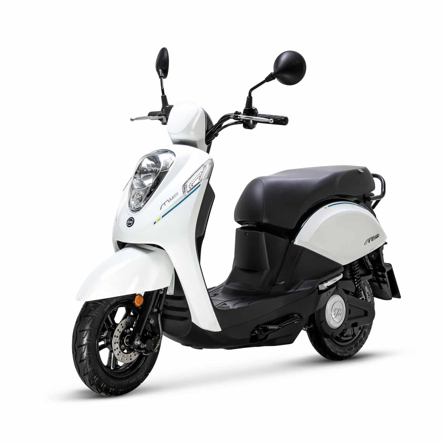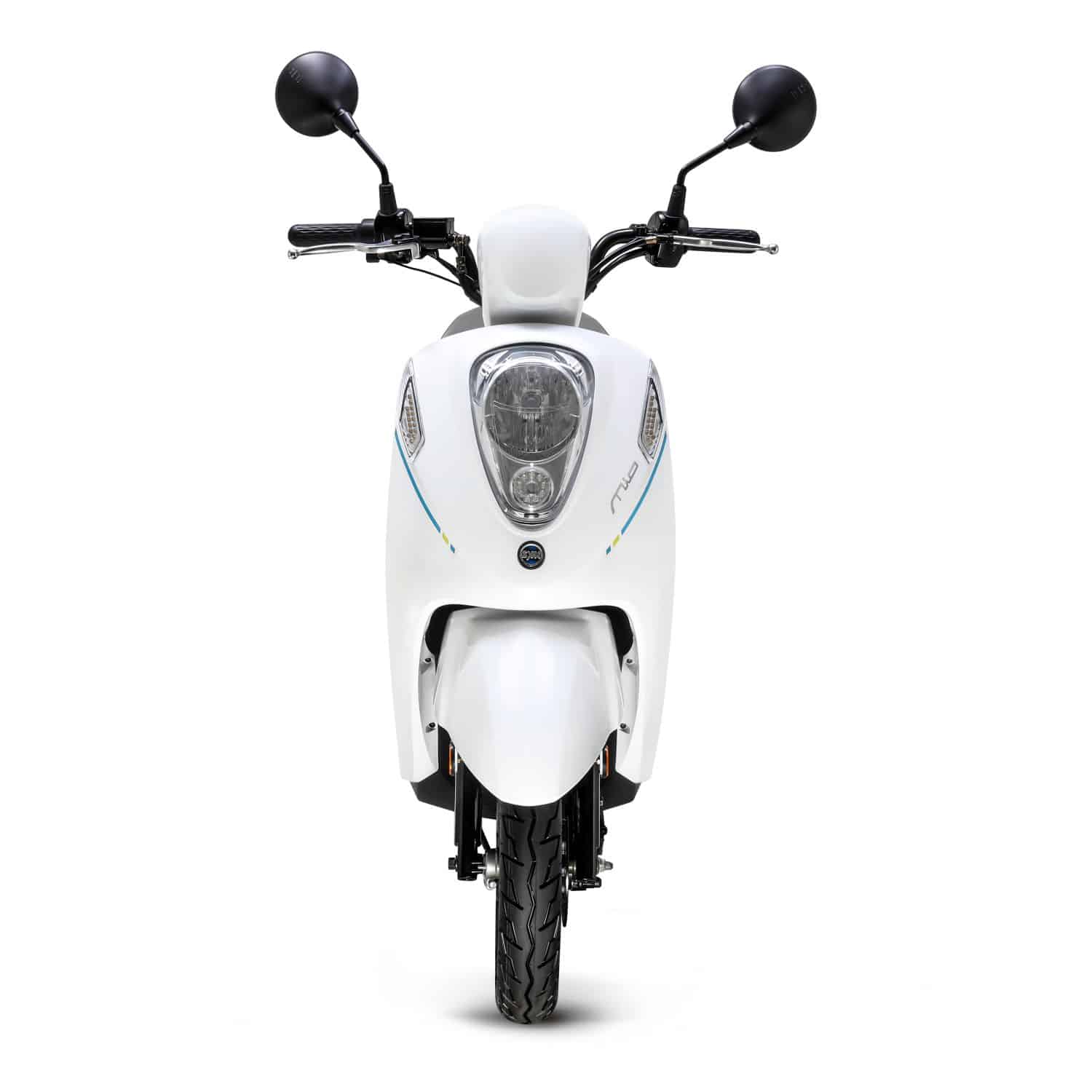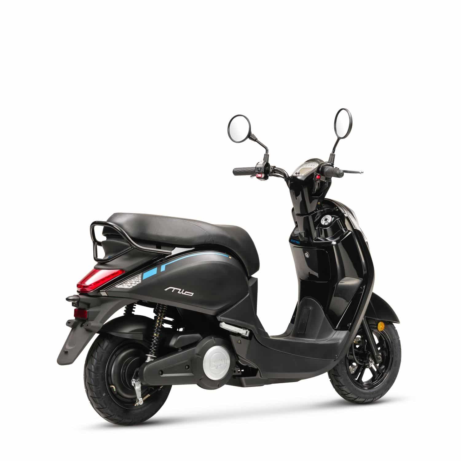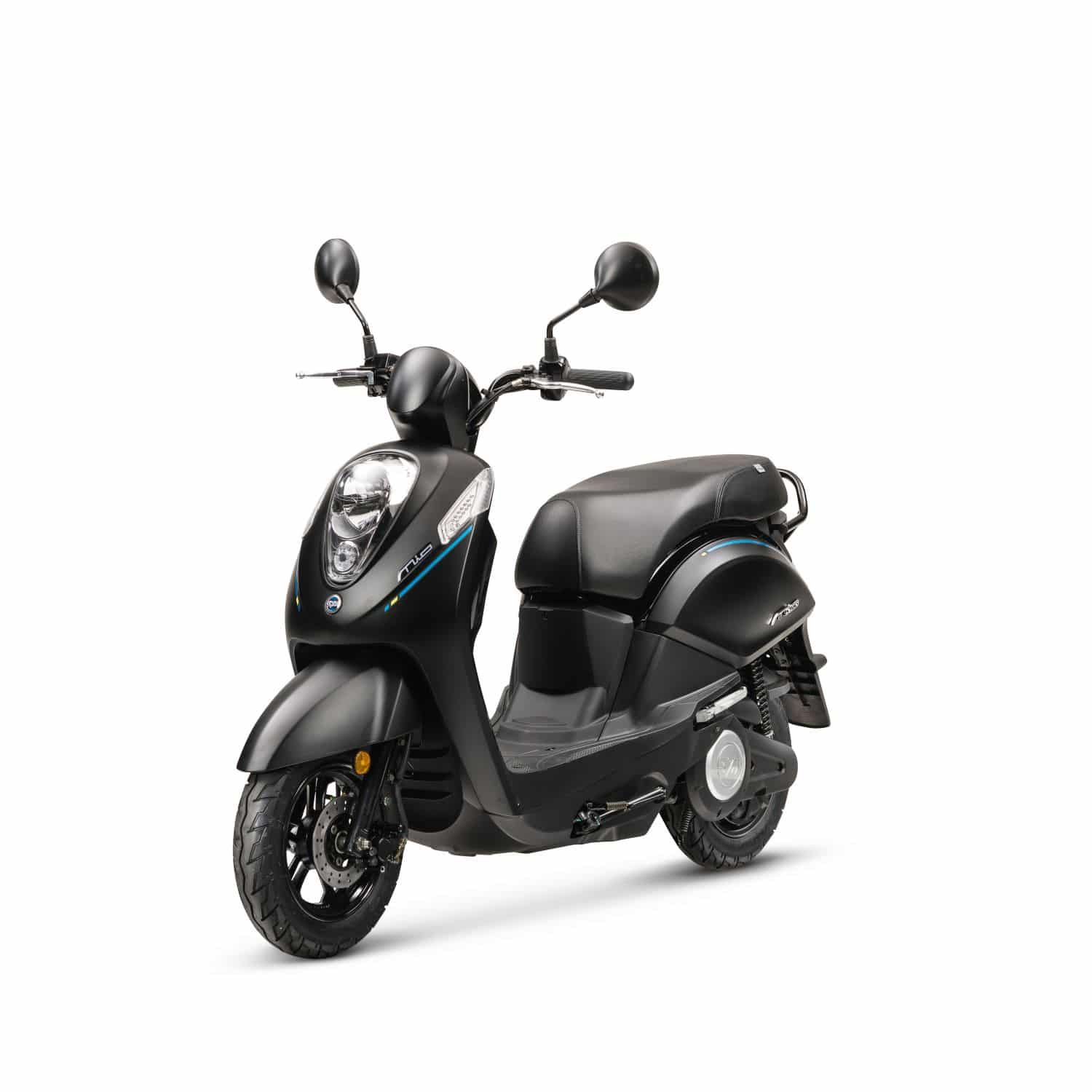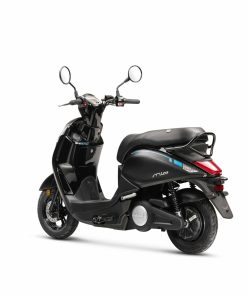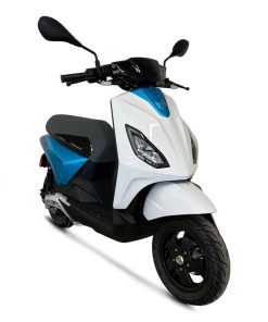 Disponible en noir, bleu ou blanc, l’e-mio est un petit scooter élégant