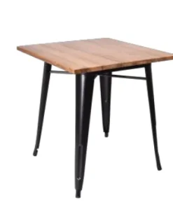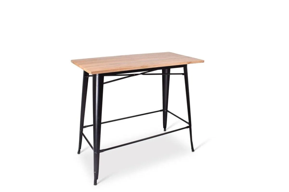 La table haute natura est une table mange-debout en location avec une structure en métal noir et une tablette en bois.