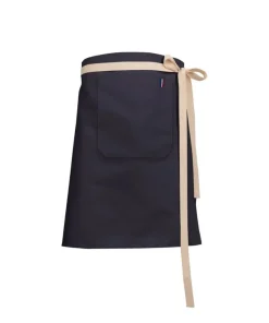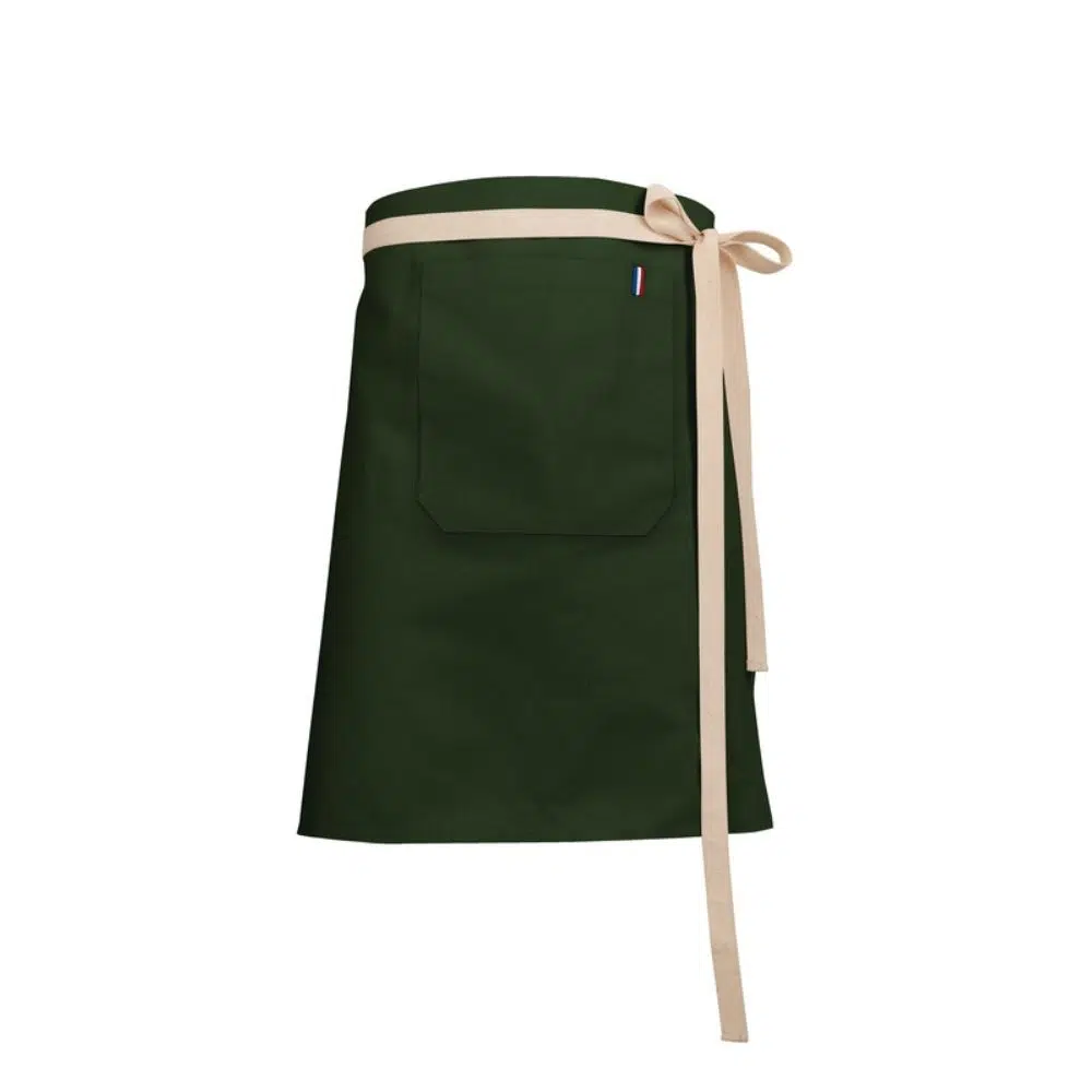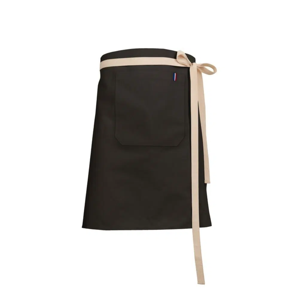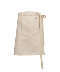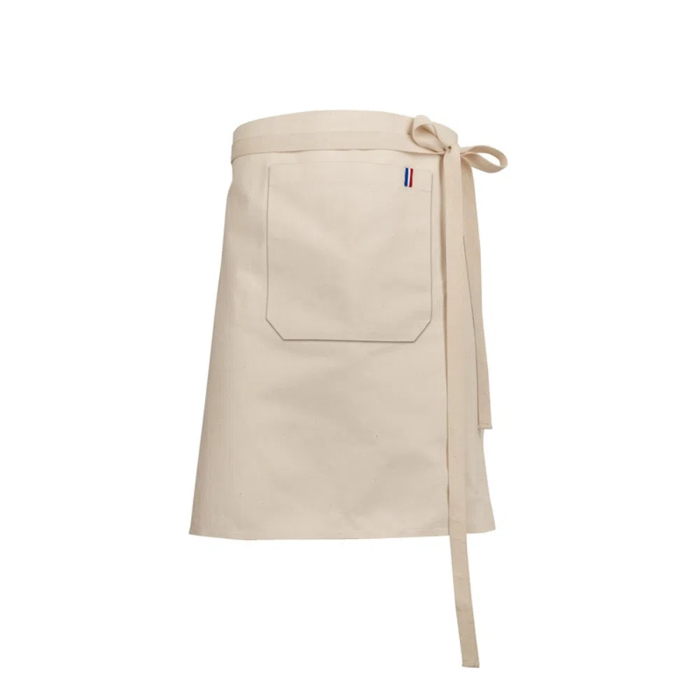 Personnalisez notre tablier court Babette en toile 240gr de coton 100% biologique avec sa poche ventrale et son détail tricolore côté haut.