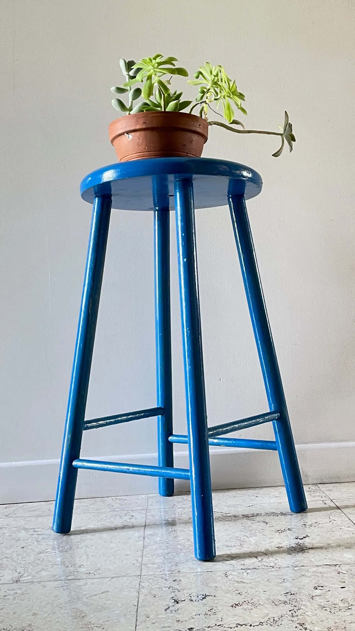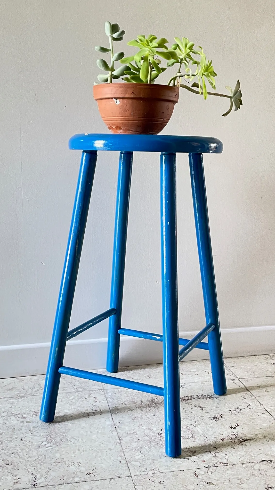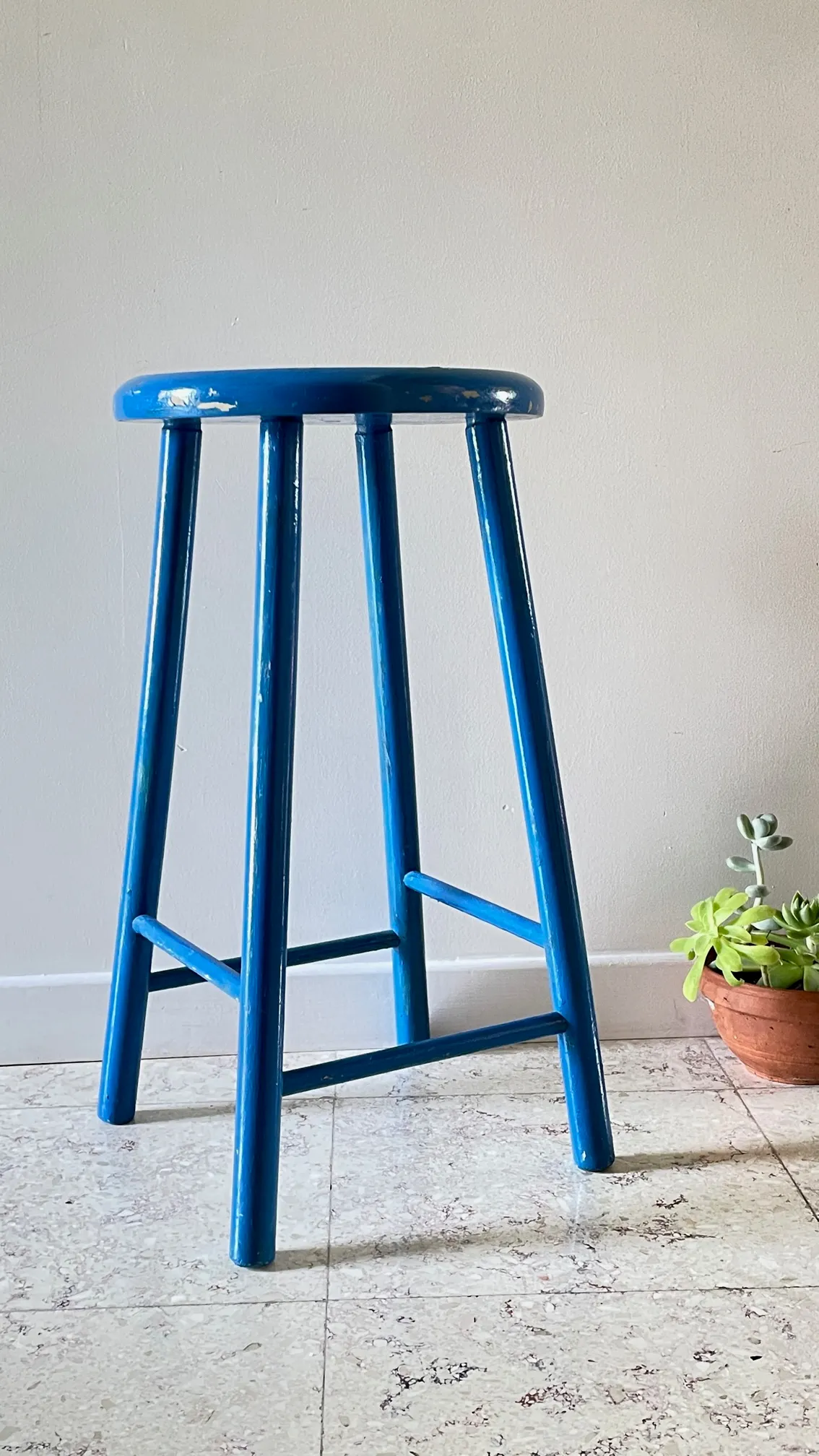On est totalement Fan de ce Tabouret vintage en Bois laqué BLEU Electrique, un tabouret qui a un Style fou et nous Inspire .