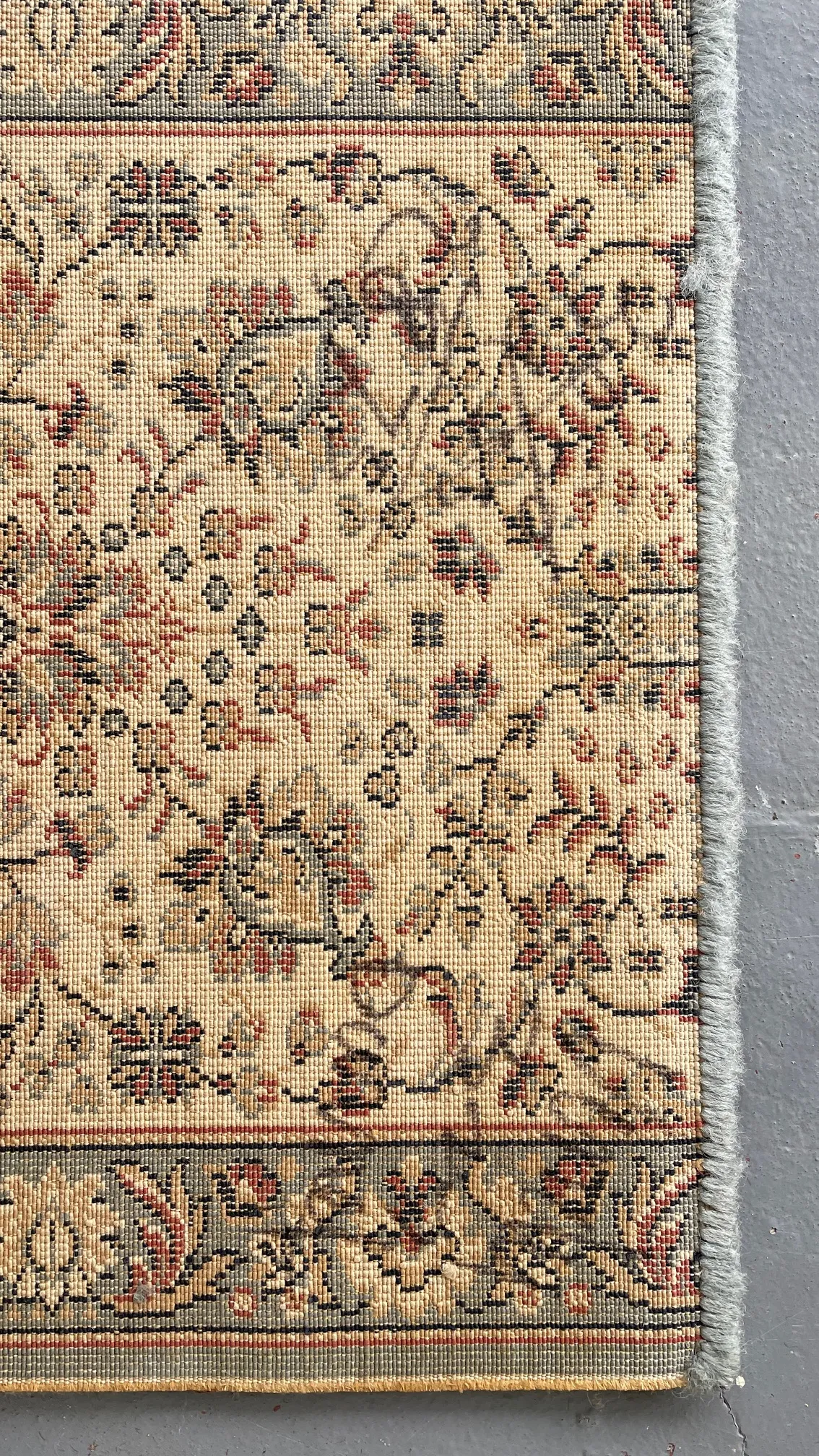 Très bon état, jolie patine du Temps, petits manques de laine sur les bords et comme taché sur son envers ( le tout visibles sur les photos) mais rien qui n’enlève à son allure. Tapis nettoyé à la Main, stocké et livré Roulé.