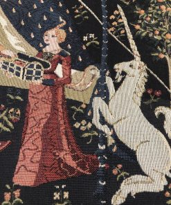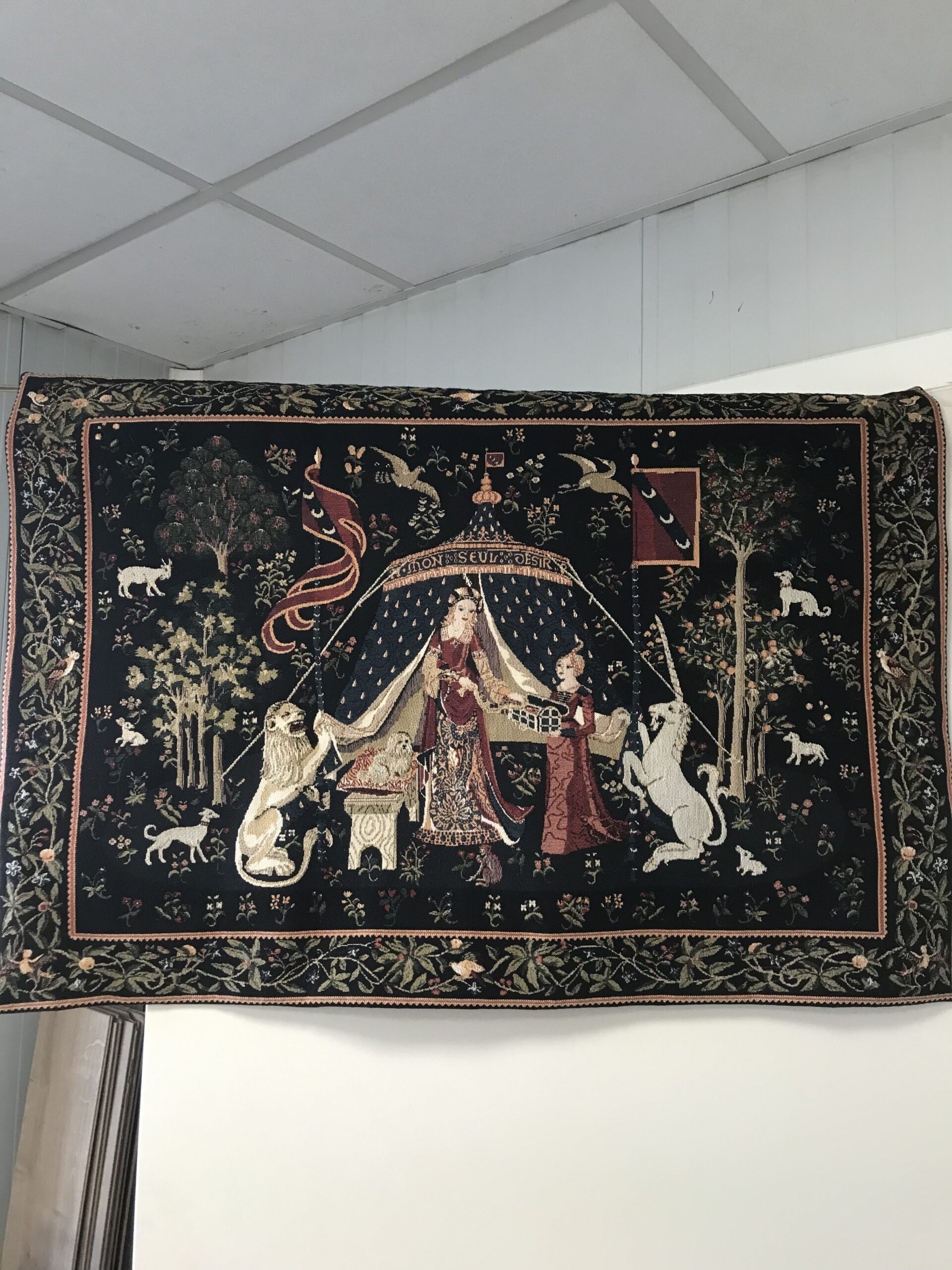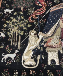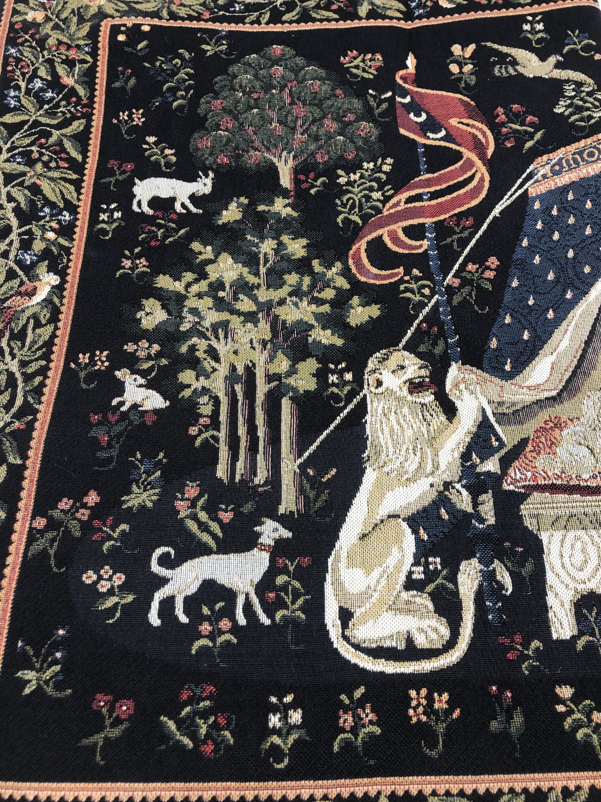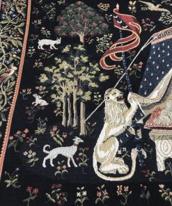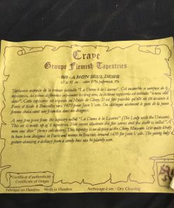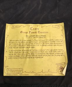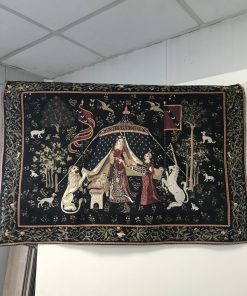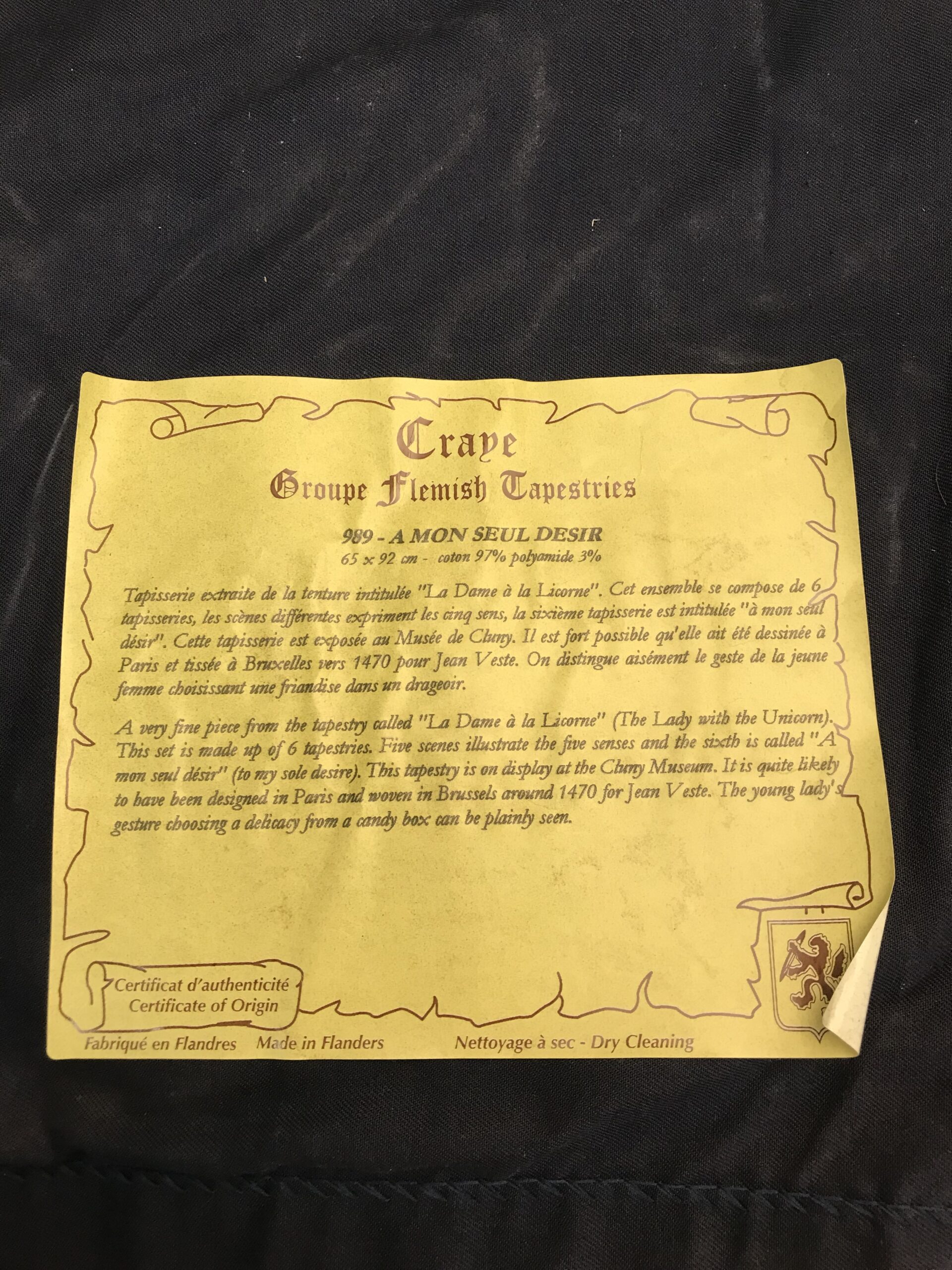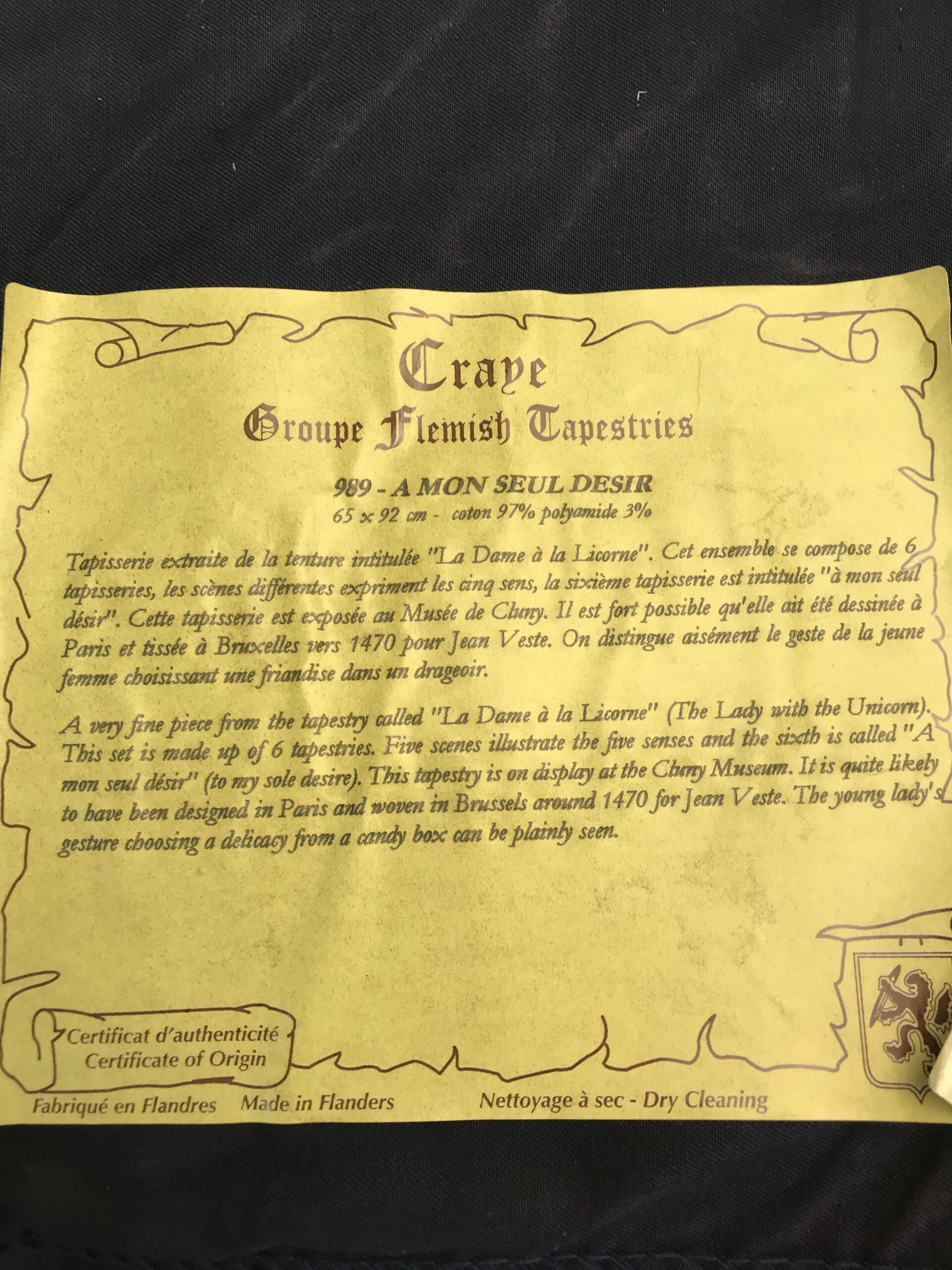 Tapisserie de mur pendante. Jolie tapisserie murale ou l’on peut lire « Amon seul désir ». Elle est en parfait état, elle représente une dame et une jeune fille qui tien un coffre. Autour d’elle un lion, des chiens, une licorne et des chèvres. Cette tapisserie à été fabriquée en Flandres. Tapisserie extraite de la tenture intitulé » La dame à la licorne ». Cette tapisserie est exposée au musée de Cluny. Il est fort possible qu’elle ait été dessinée à Paris et tissée à Bruxelles vers 1470 pour Jean Veste. Nous retrouvons toutes ces informations au dos sur le certificat d’authenticité. Une belle pièce de décoration qui donnera le ton. Elle mesure 65 x 92 cm coton 97% et polyamide 3%. Avis aux amateurs de ce type de produits et cette forme d’art. La tige métallique pour la tenir est fournie mais il manque un coin qui est juste décoratif.
