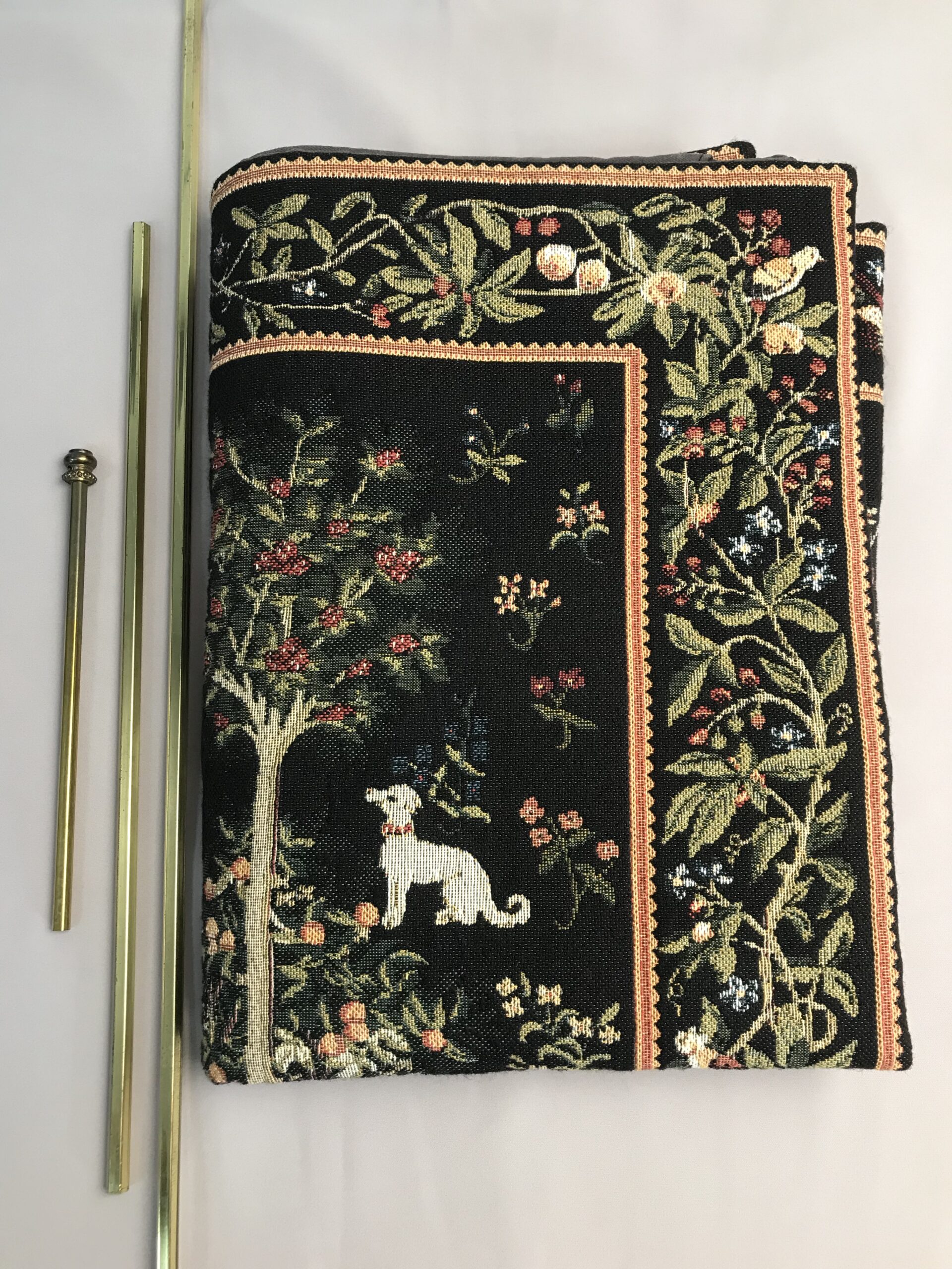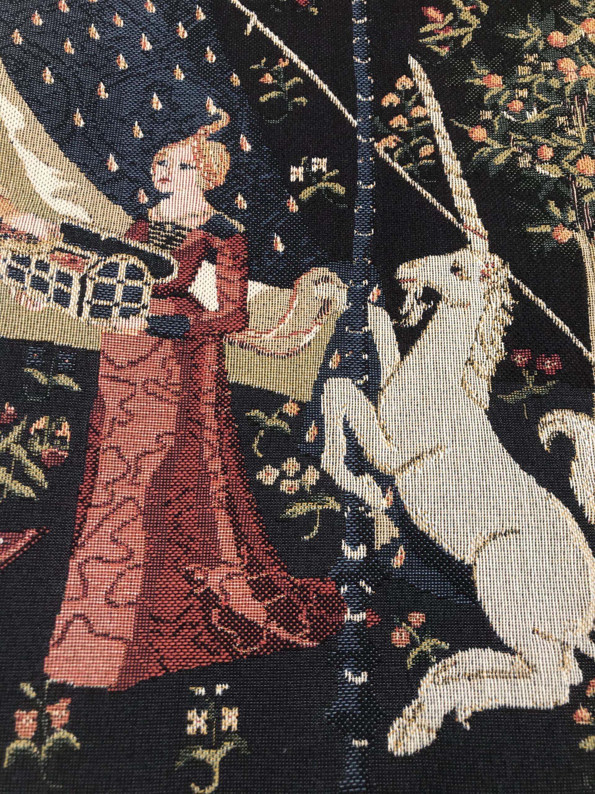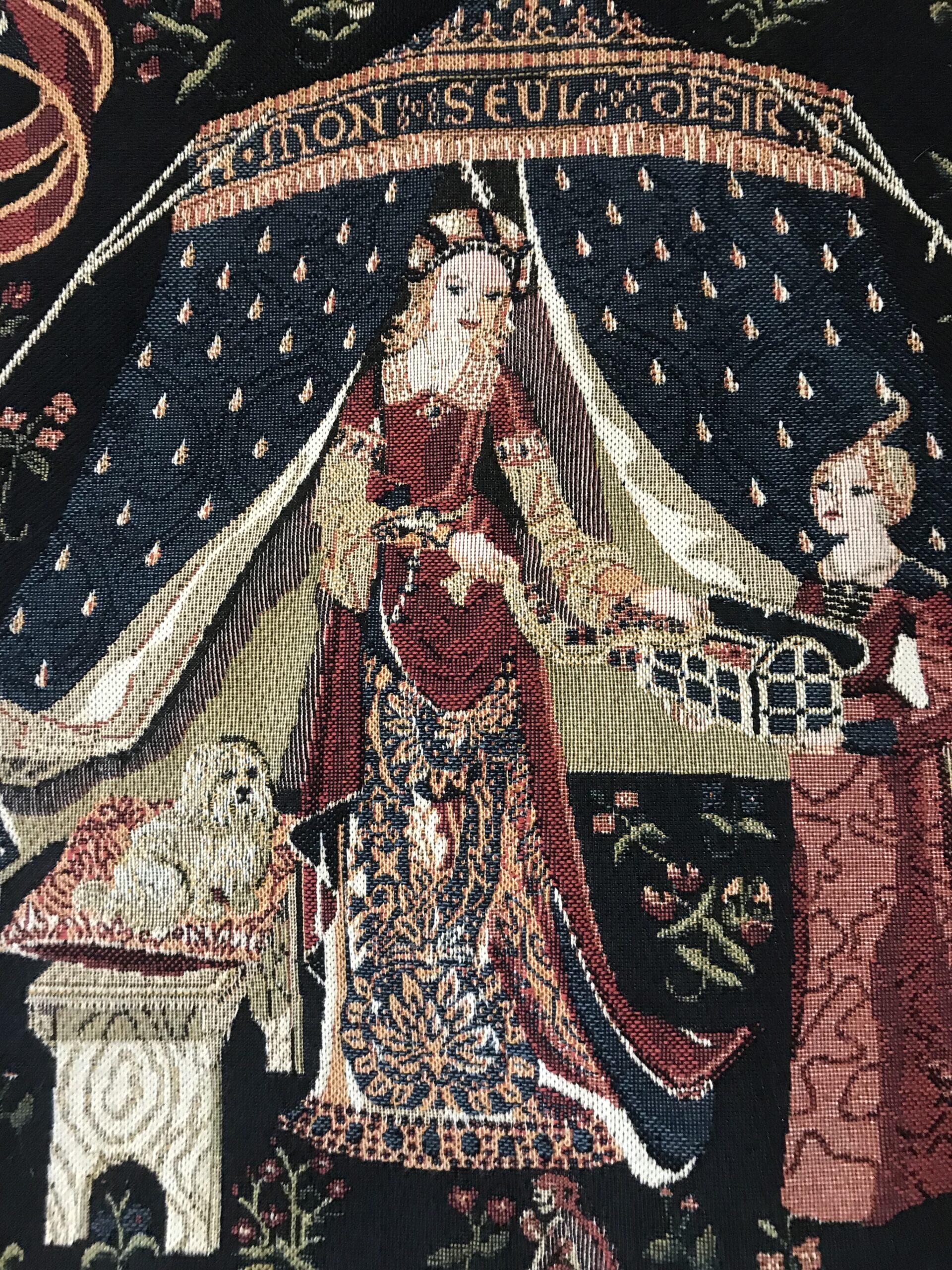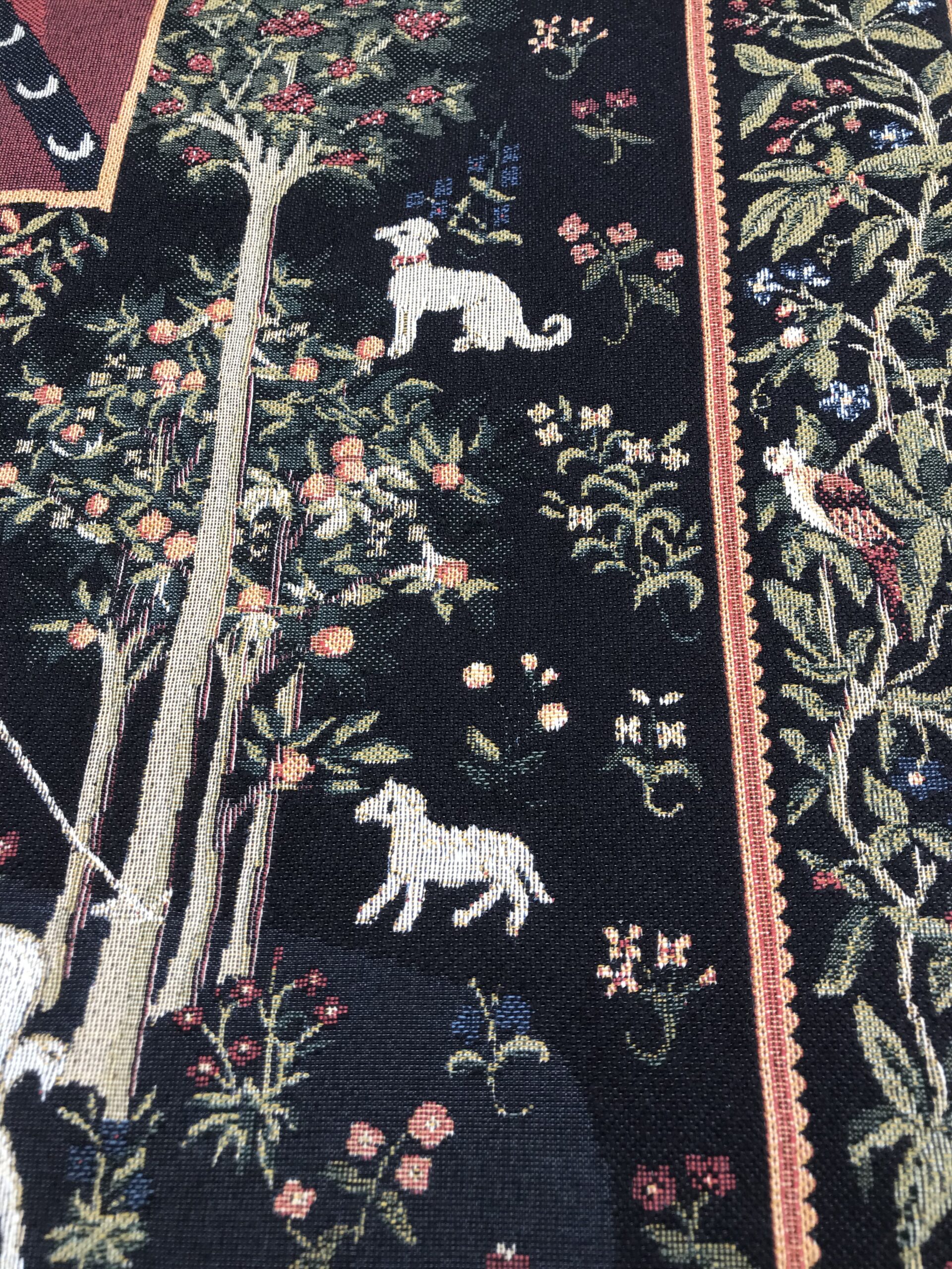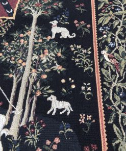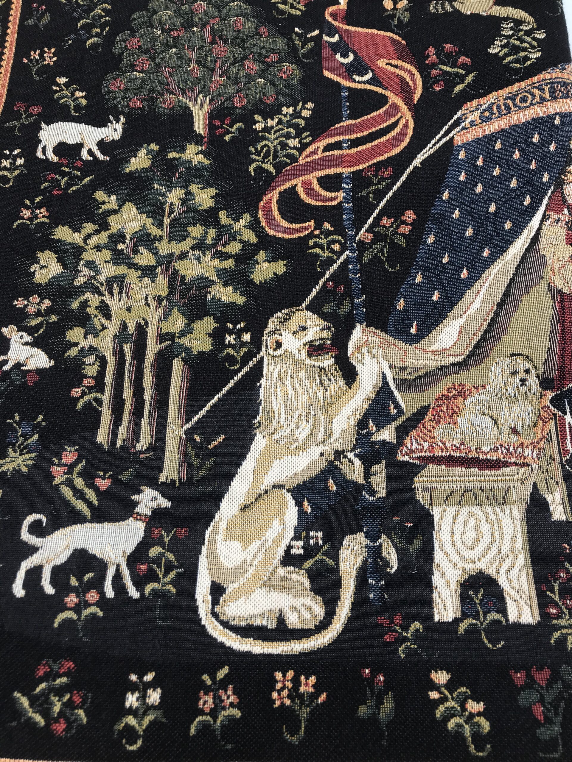 Tapisserie de mur pendante. Jolie tapisserie murale ou l’on peut lire « Amon seul désir ». Elle est en parfait état, elle représente une dame et une jeune fille qui tien un coffre. Autour d’elle un lion, des chiens, une licorne et des chèvres. Cette tapisserie à été fabriquée en Flandres. Tapisserie extraite de la tenture intitulé » La dame à la licorne ». Cette tapisserie est exposée au musée de Cluny. Il est fort possible qu’elle ait été dessinée à Paris et tissée à Bruxelles vers 1470 pour Jean Veste. Nous retrouvons toutes ces informations au dos sur le certificat d’authenticité. Une belle pièce de décoration qui donnera le ton. Elle mesure 65 x 92 cm coton 97% et polyamide 3%. Avis aux amateurs de ce type de produits et cette forme d’art. La tige métallique pour la tenir est fournie mais il manque un coin qui est juste décoratif.