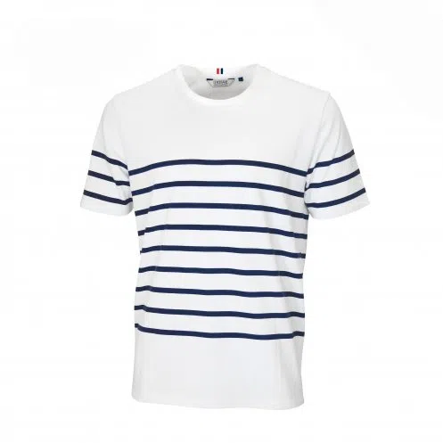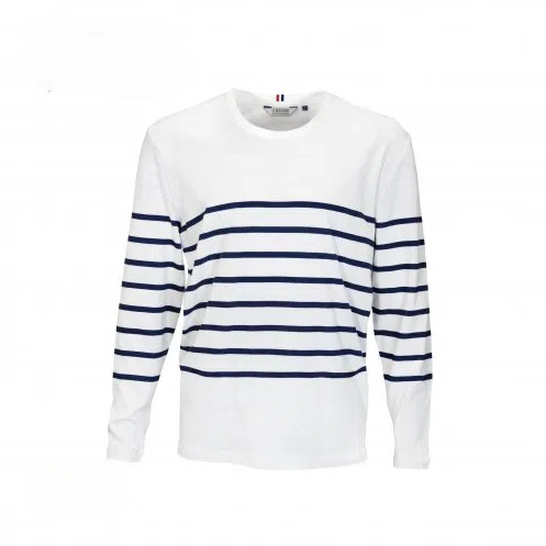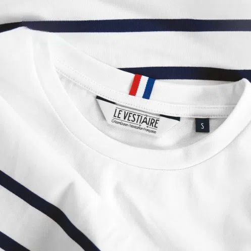 Le coton biologique de 230gr/m² offre une sensation de douceur exceptionnelle contre la peau et garantit une durabilité accrue. Disponible en écru avec des rayures bleu marine, elle incarne parfaitement le style français.