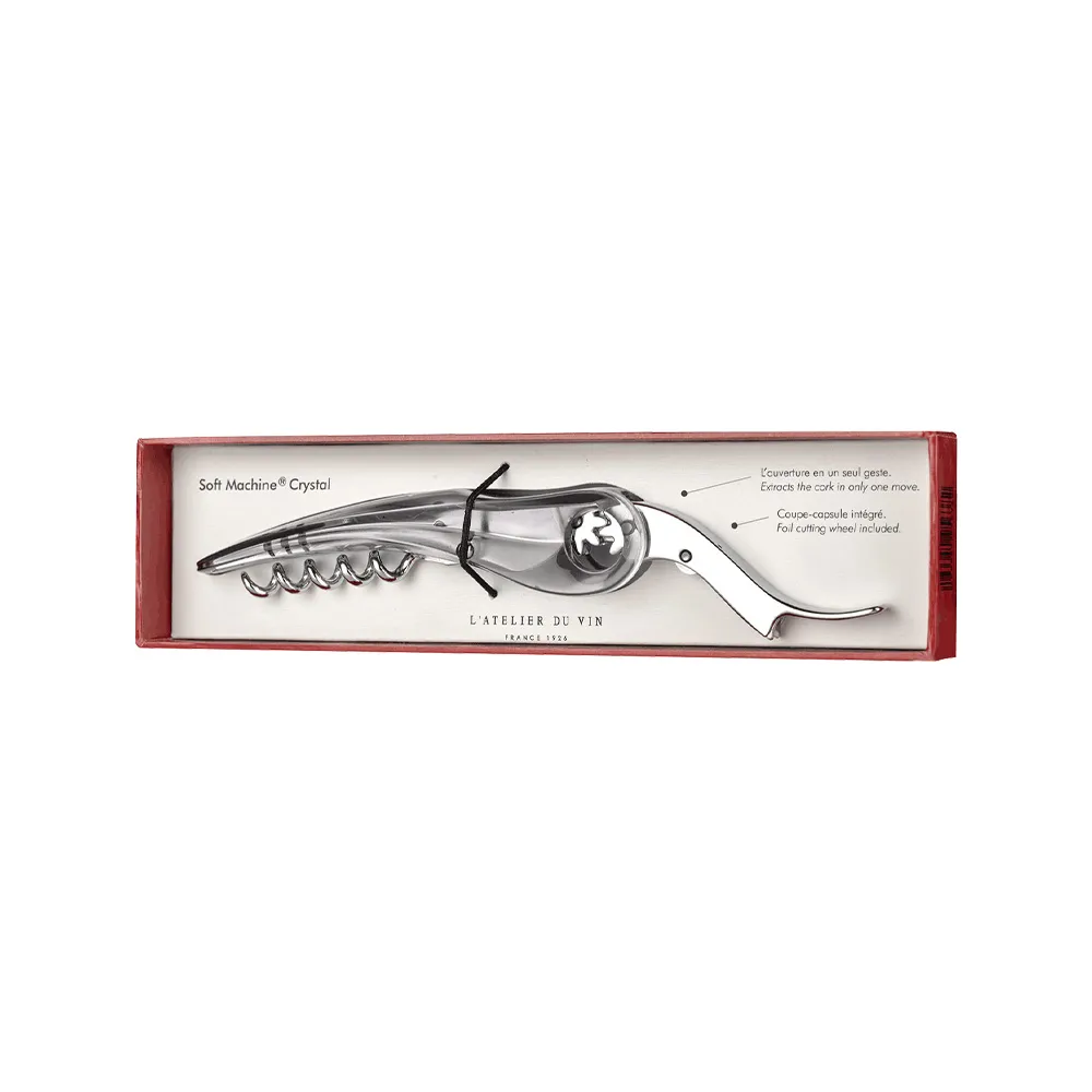 Le « Soft Machine Crystal » a toutes les caractéristiques : Système d’extraction très fluide, Fiabilité du maintien levier d’appui sur le goulot de la bouteille, Lame coupe-capsule intégrée, Design unique.