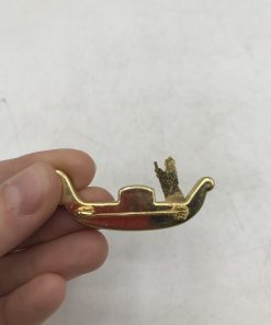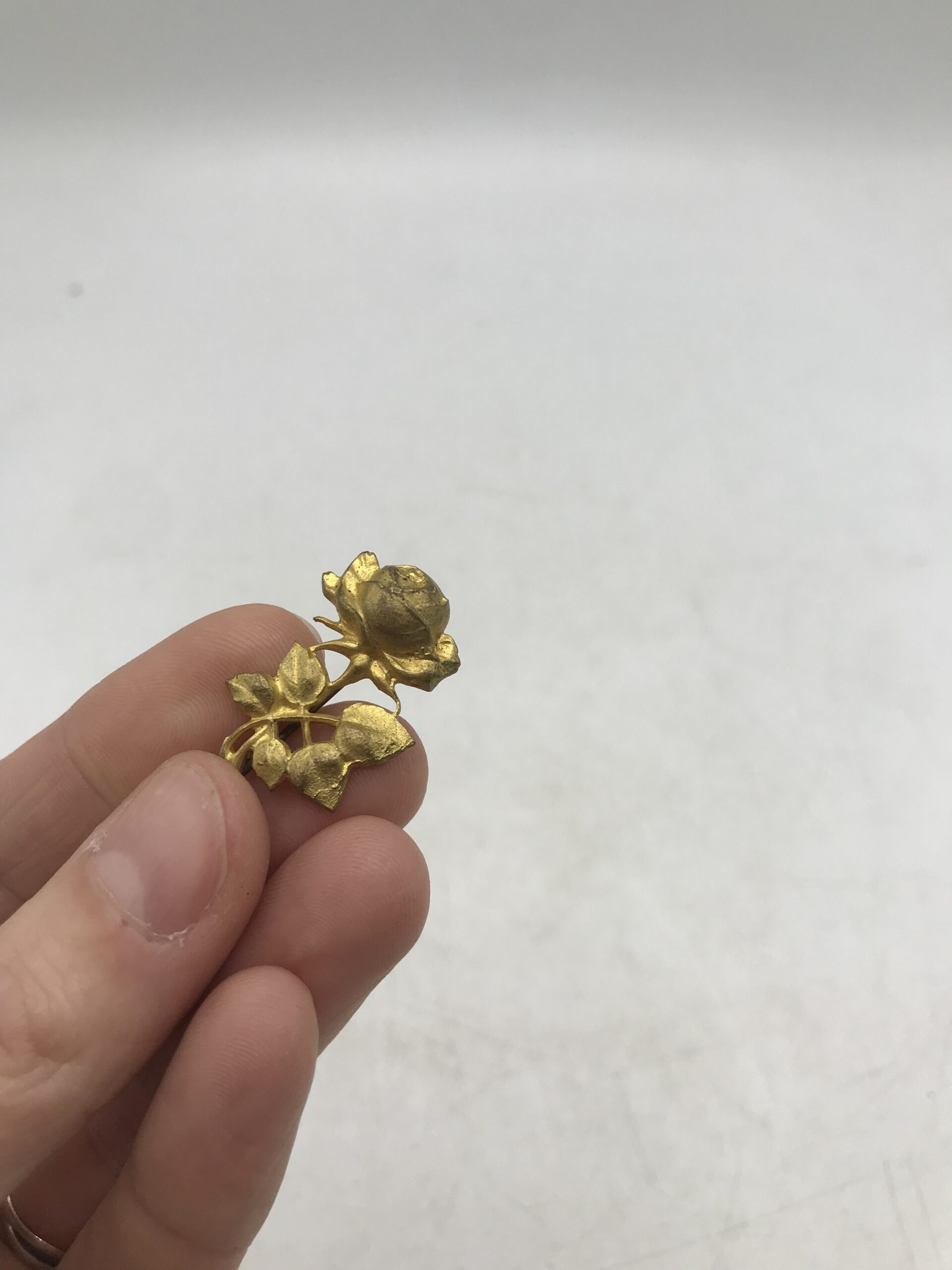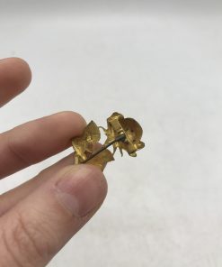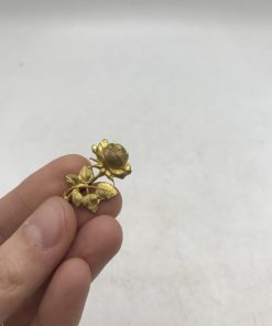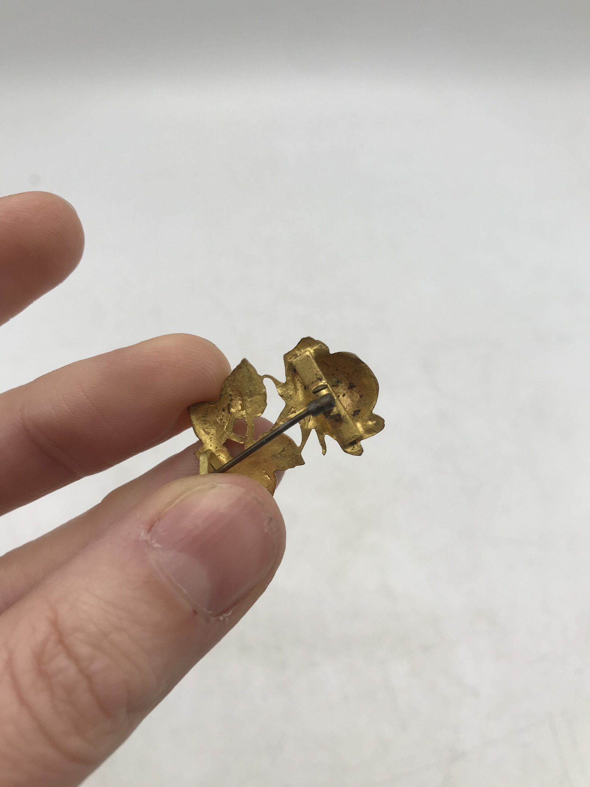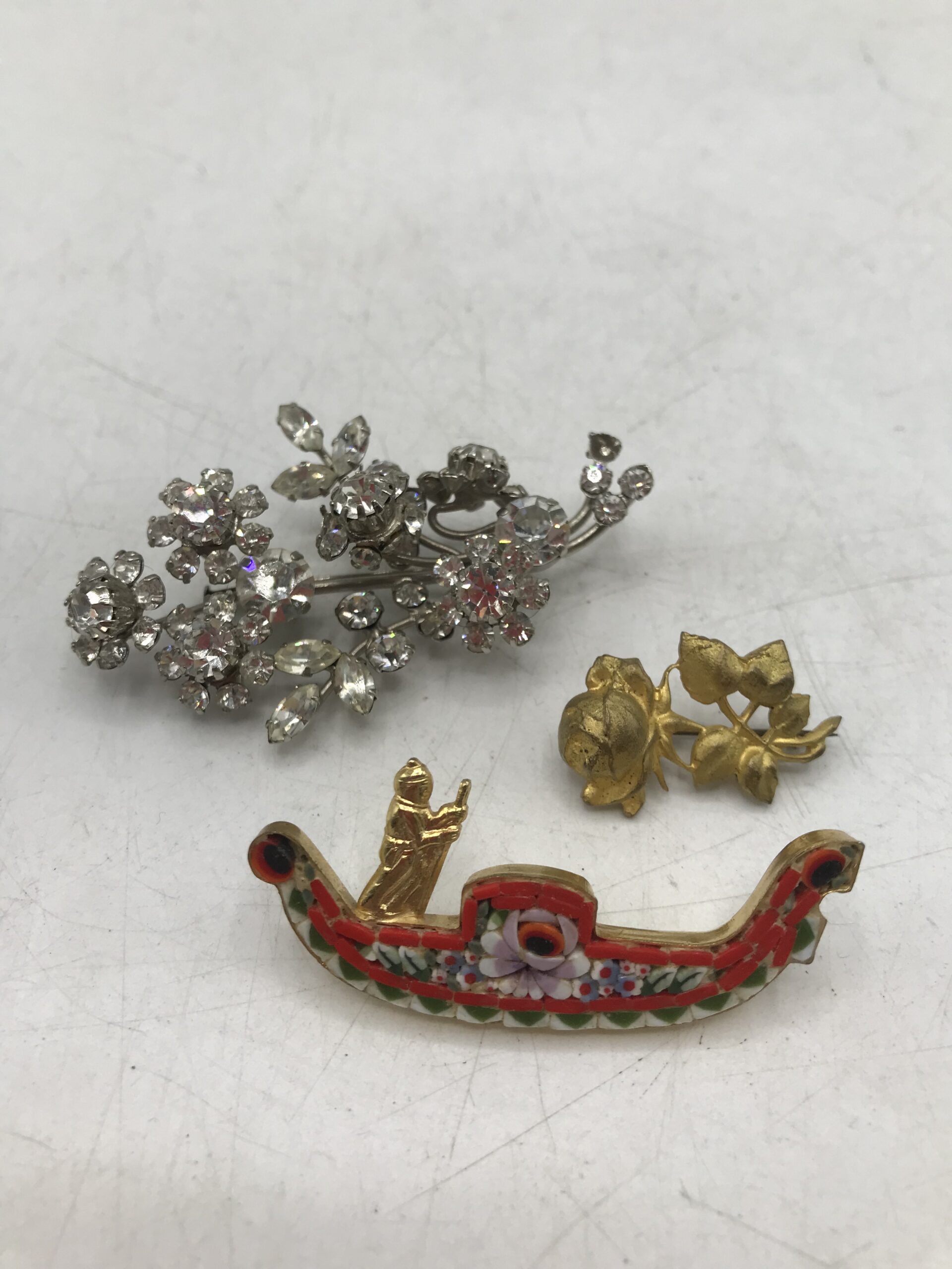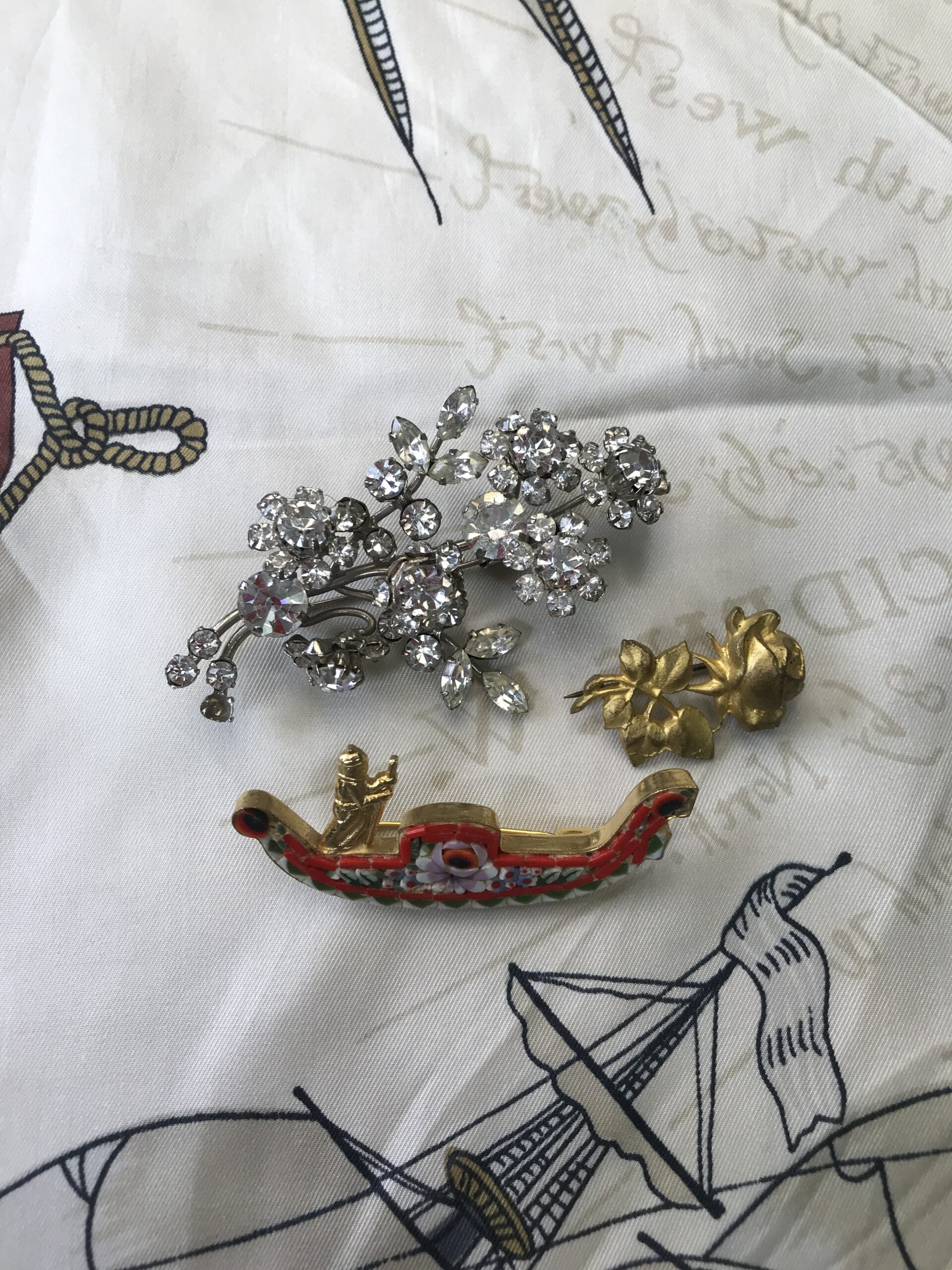 Très joli trio de broches fleurs vintage. La première est en strass sur une monture en métal, elle représente des branches avec des fleurs. Elle a une taille de 7 cm par 4 cm. La deuxième représente un bateau avec un navigateur, elle est décorée d’une mosaïque représentant une fleur sur fond doré. Elle a une taille de 5,5 cm sur 2,5 cm. La troisième est en métal doré et représente une rose, elle a une taille de 3 cm par 1,5 cm. Jolis accessoires qui apporteront la touche vintage à votre look. Les broches sont anciennes, elles portent des traces d’usures.