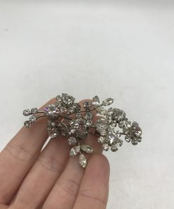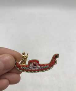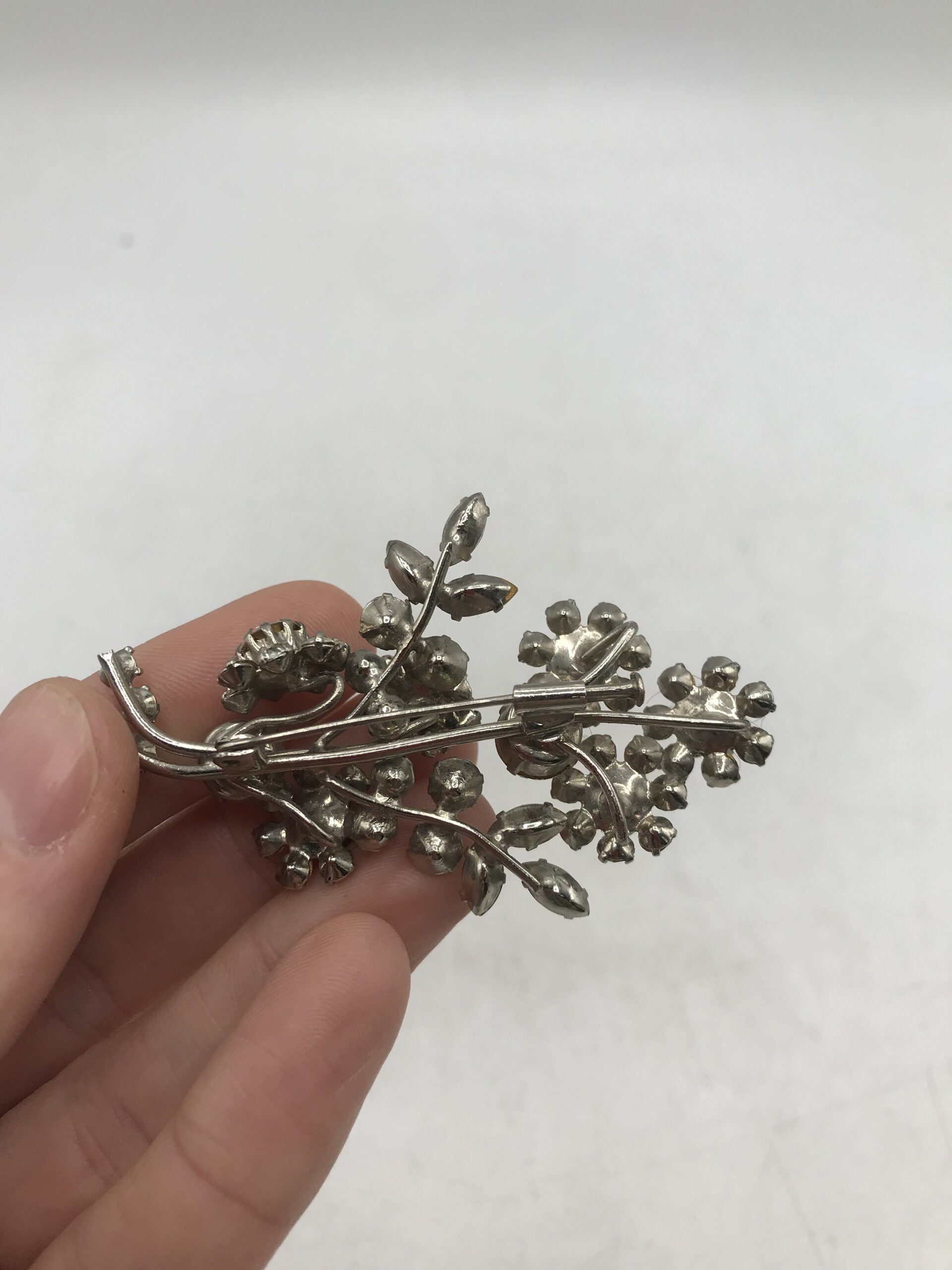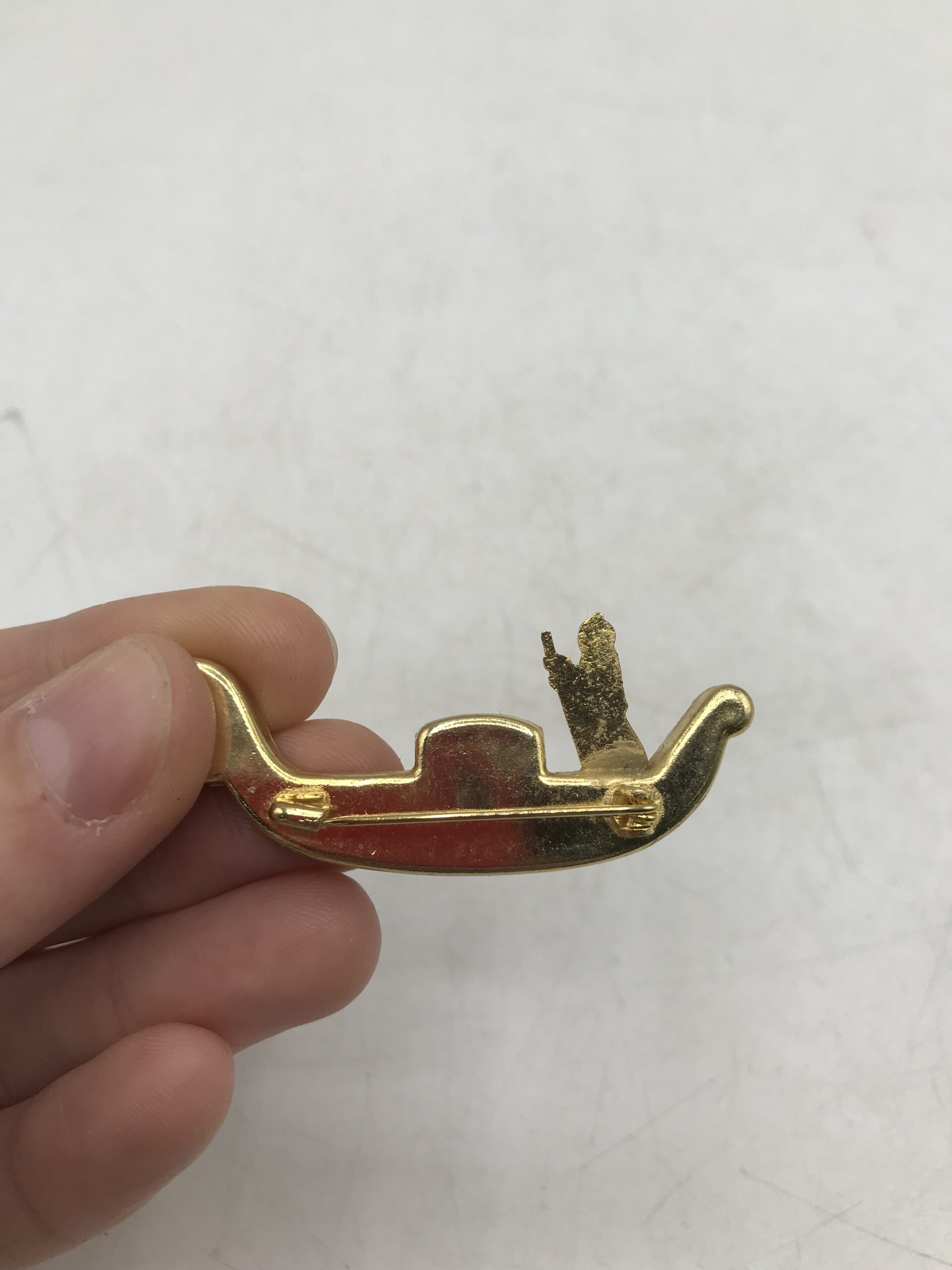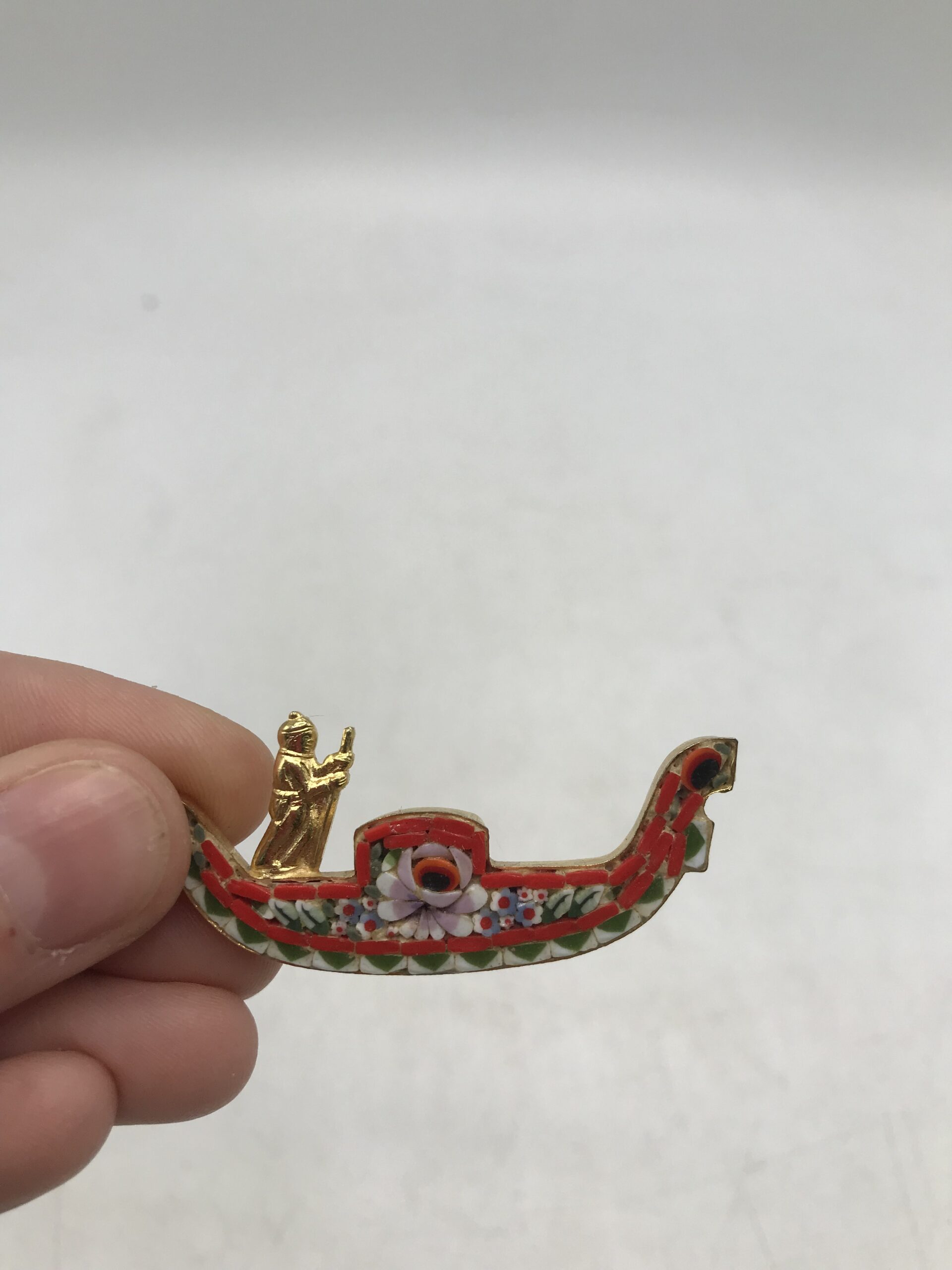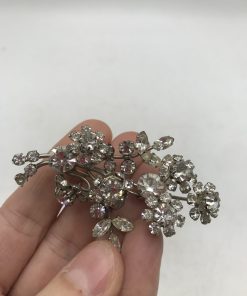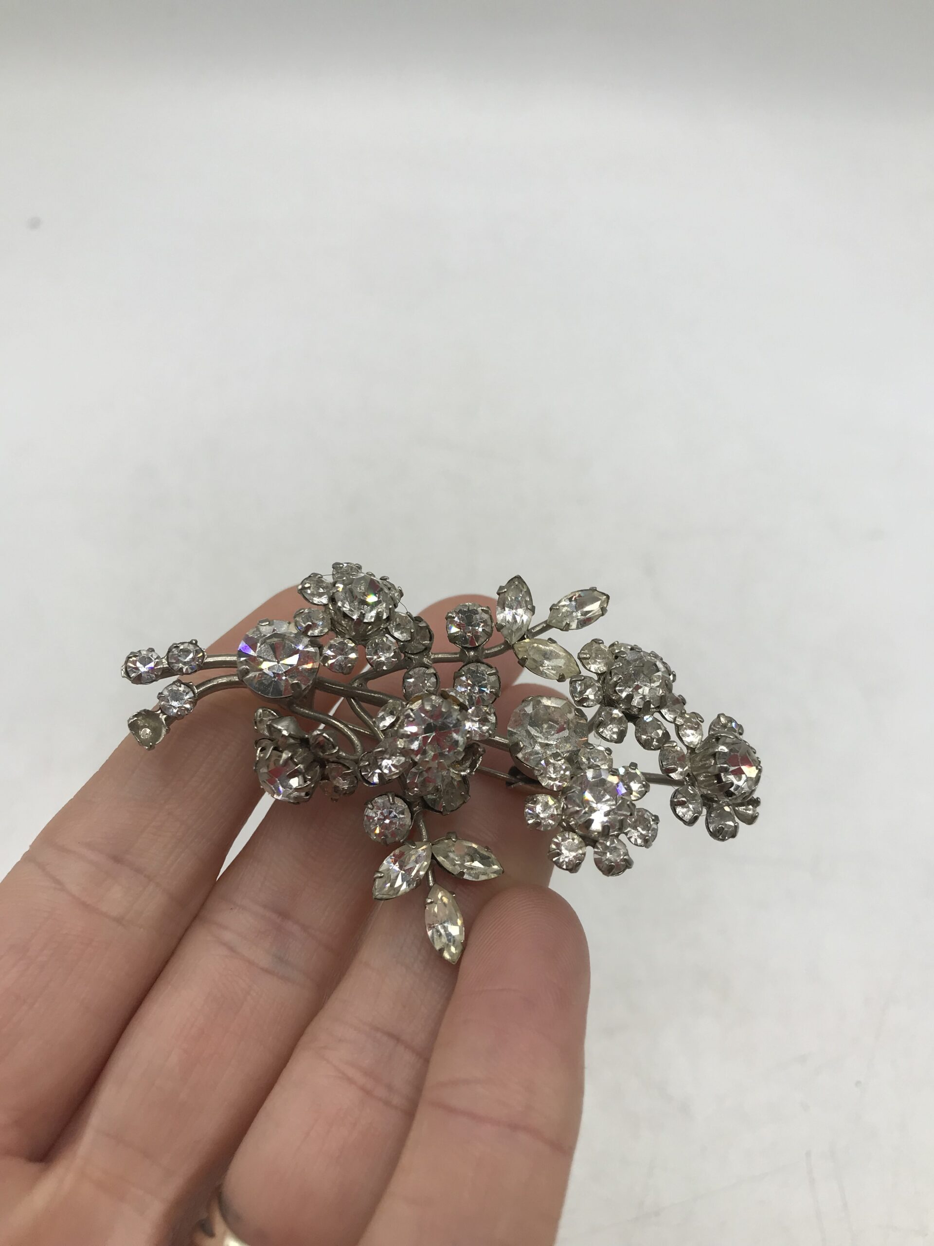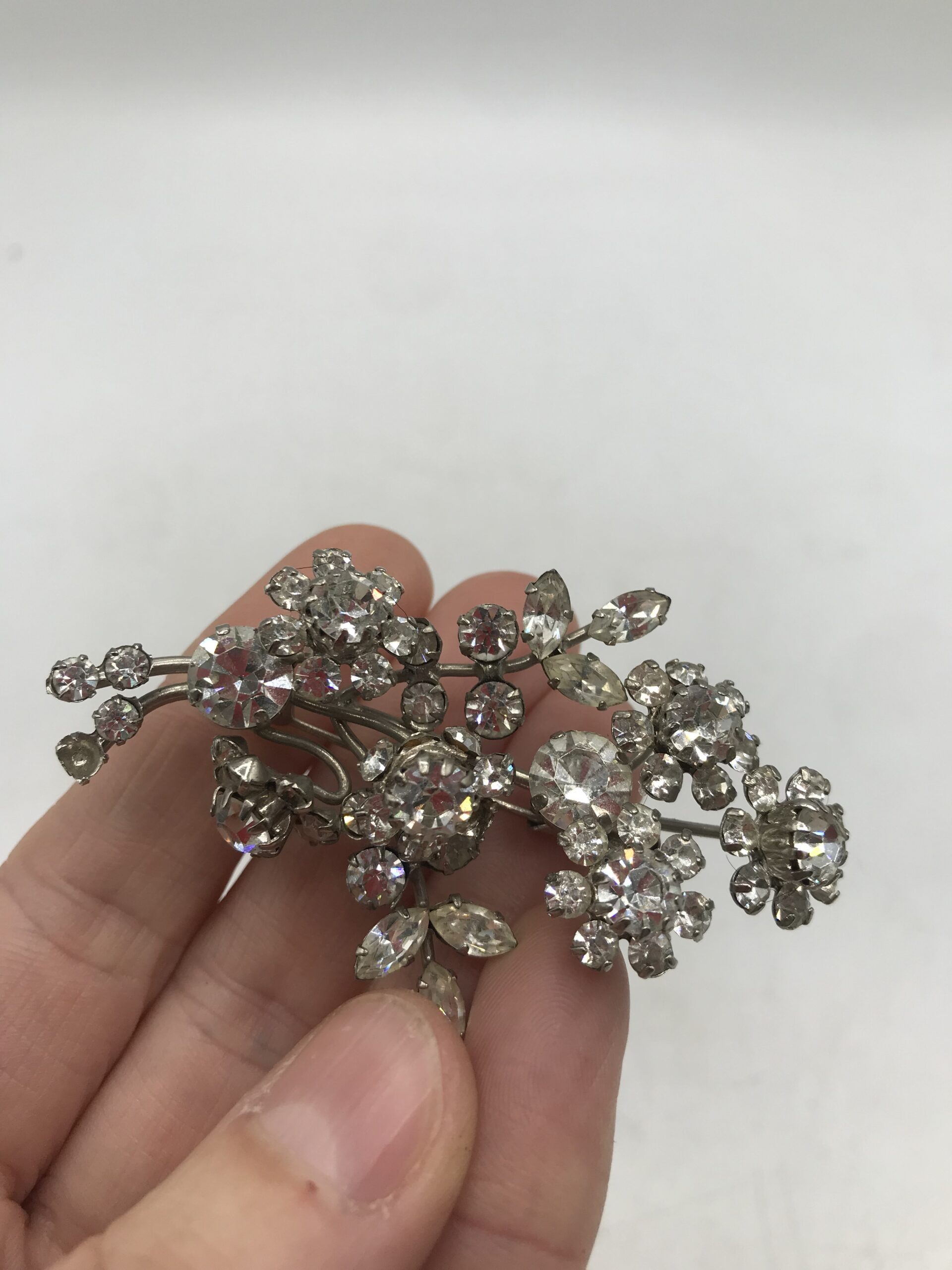 Très joli trio de broches fleurs vintage. La première est en strass sur une monture en métal, elle représente des branches avec des fleurs. Elle a une taille de 7 cm par 4 cm. La deuxième représente un bateau avec un navigateur, elle est décorée d’une mosaïque représentant une fleur sur fond doré. Elle a une taille de 5,5 cm sur 2,5 cm. La troisième est en métal doré et représente une rose, elle a une taille de 3 cm par 1,5 cm. Jolis accessoires qui apporteront la touche vintage à votre look. Les broches sont anciennes, elles portent des traces d’usures.