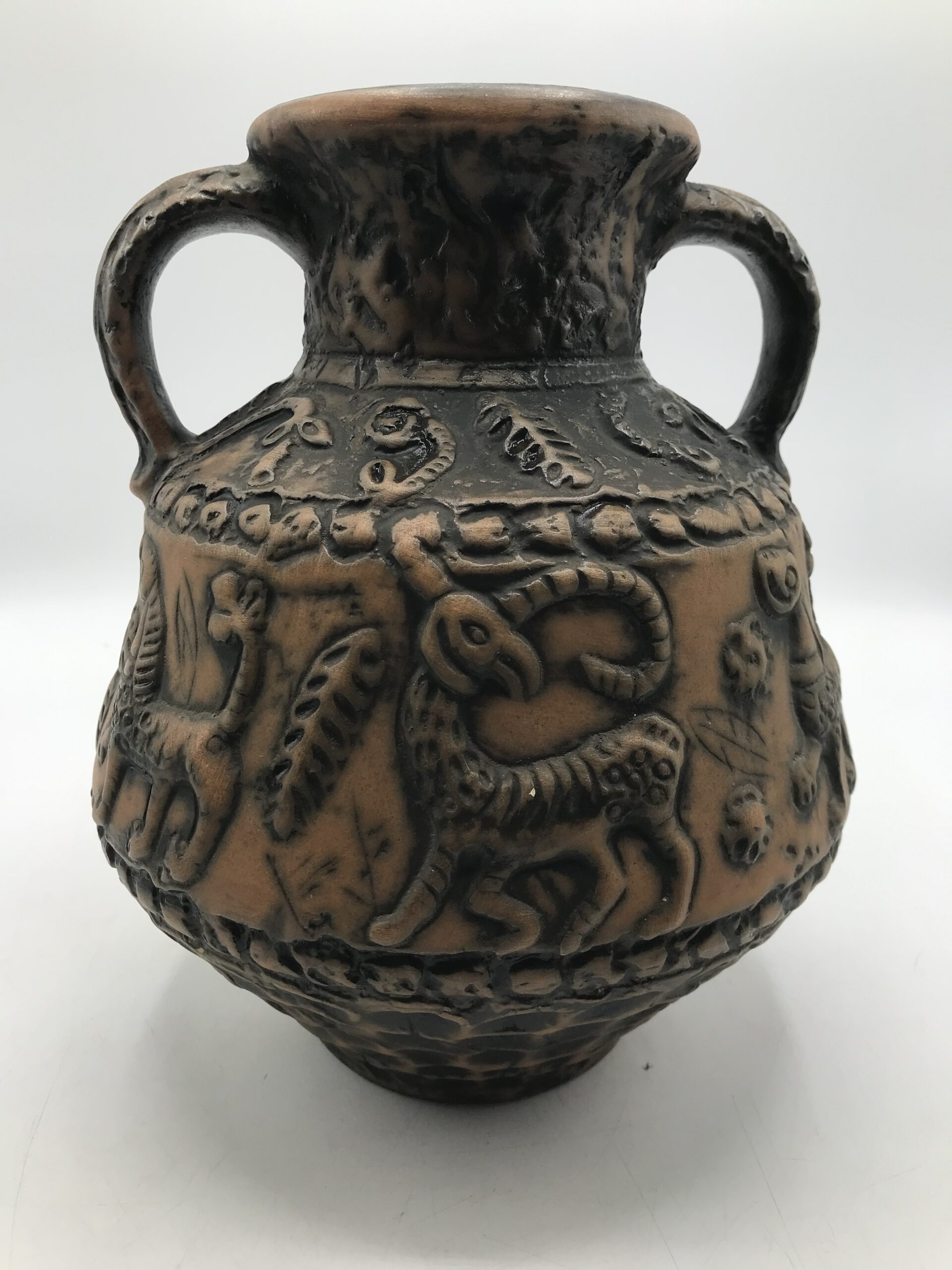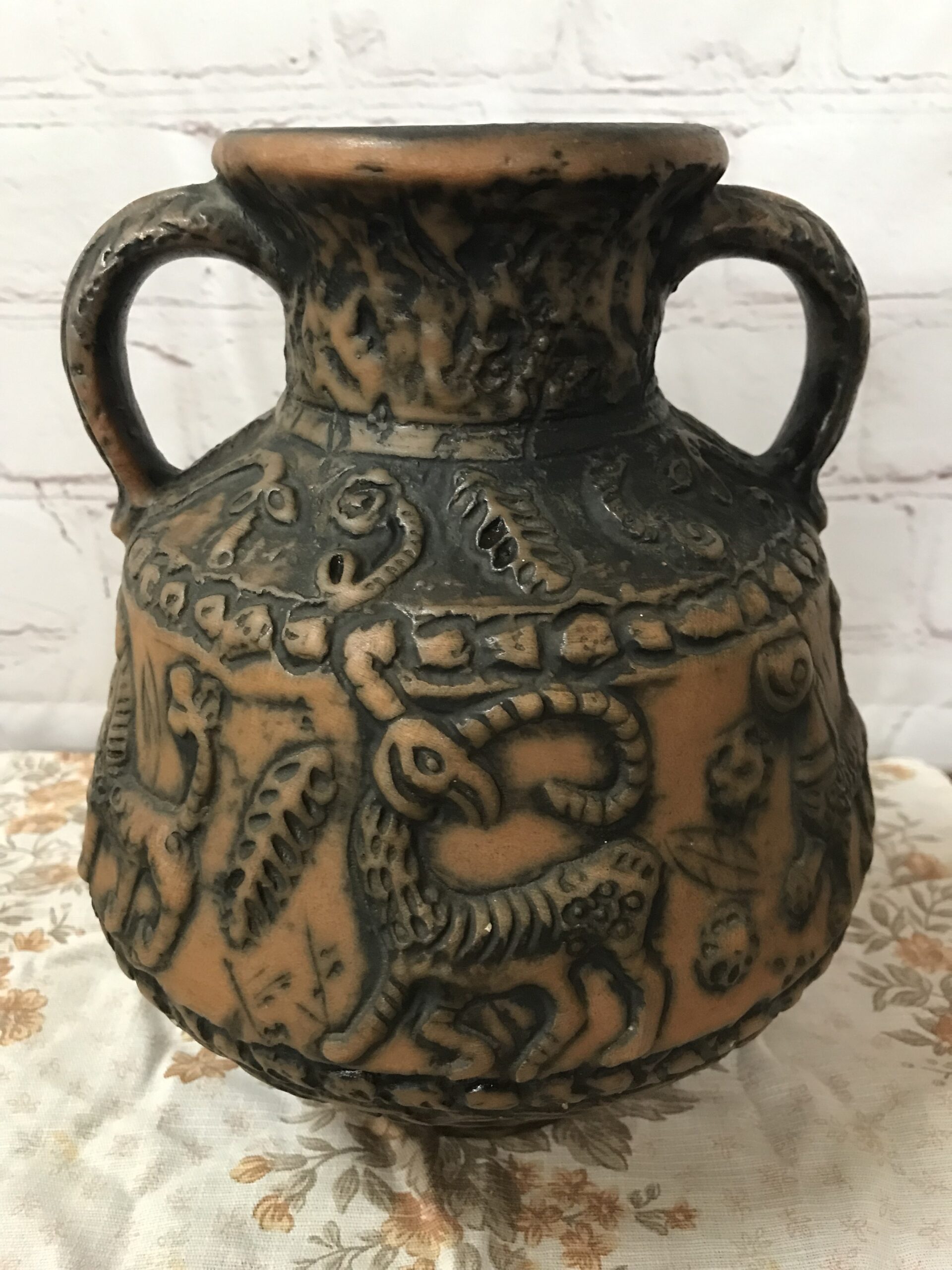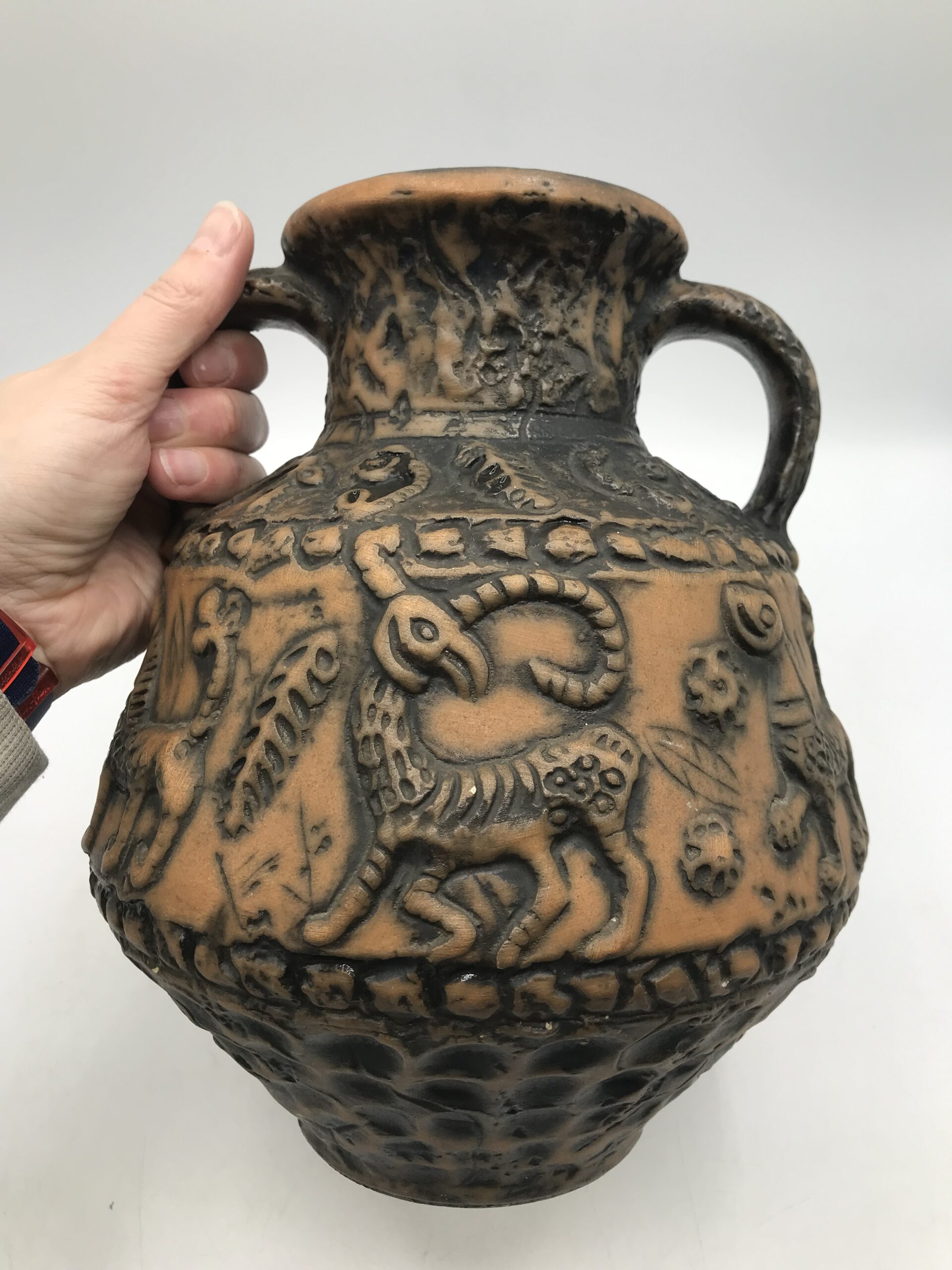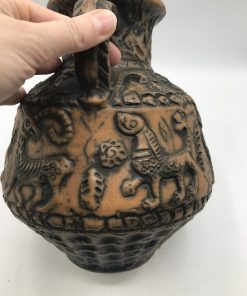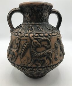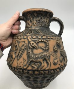 Vase animaux par Jasba années 60. Superbe vase en céramique des années 60 signé Jasba. Le vase est en bon état pas de casse à signaler. De couleur terre et orangée, on y voir des représentations d’animaux. Très jolie pièce de décoration intérieur ou extérieur. Pour les fans de poteries et de pièces originales ce vase va faire mouche. Avec son aspect rustique, il respire l’authenticité. Il à une hauteur de 26 cm est un diamètre de 21 cm.