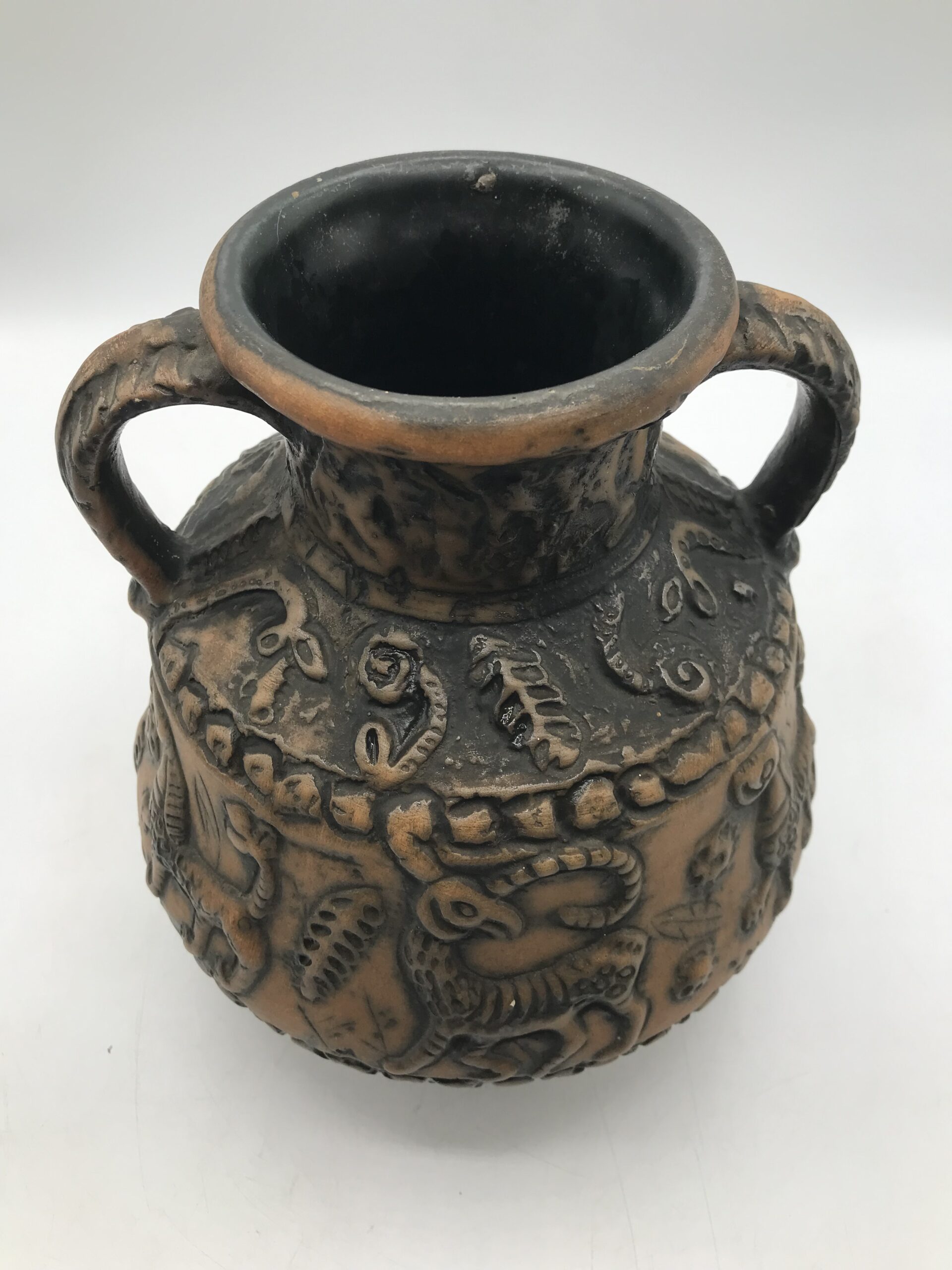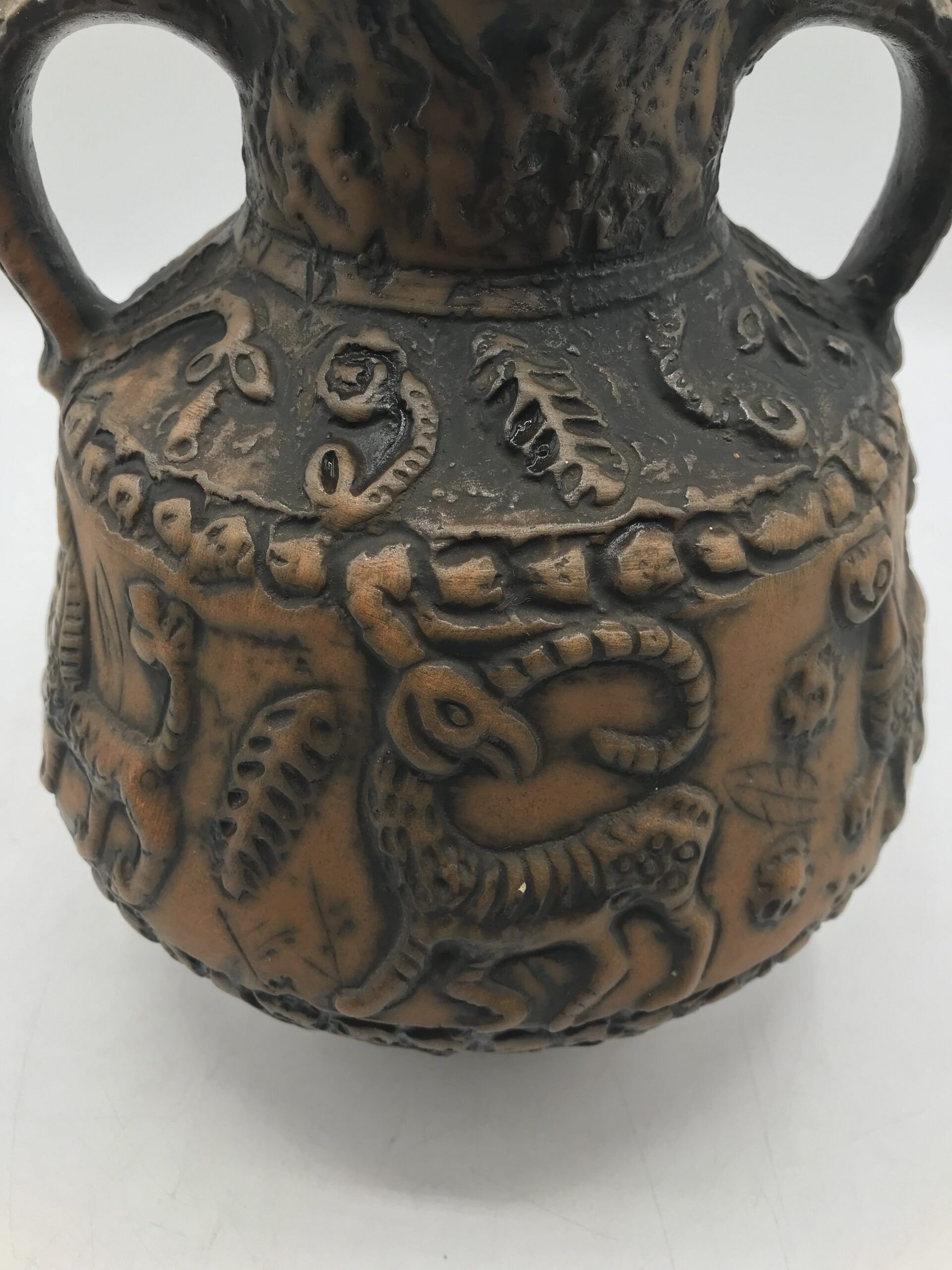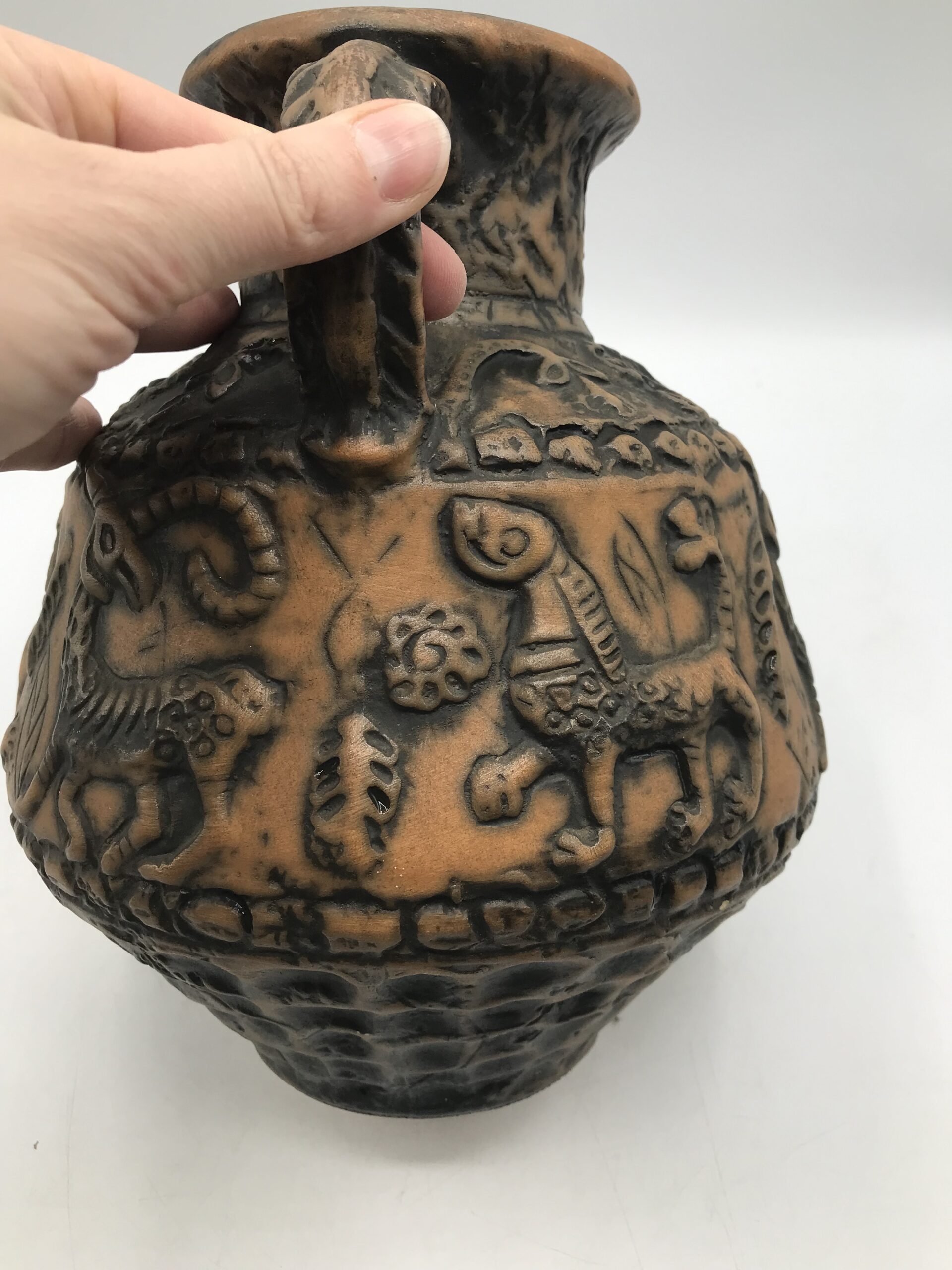 Vase animaux par Jasba années 60. Superbe vase en céramique des années 60 signé Jasba. Le vase est en bon état pas de casse à signaler. De couleur terre et orangée, on y voir des représentations d’animaux. Très jolie pièce de décoration intérieur ou extérieur. Pour les fans de poteries et de pièces originales ce vase va faire mouche. Avec son aspect rustique, il respire l’authenticité. Il à une hauteur de 26 cm est un diamètre de 21 cm.