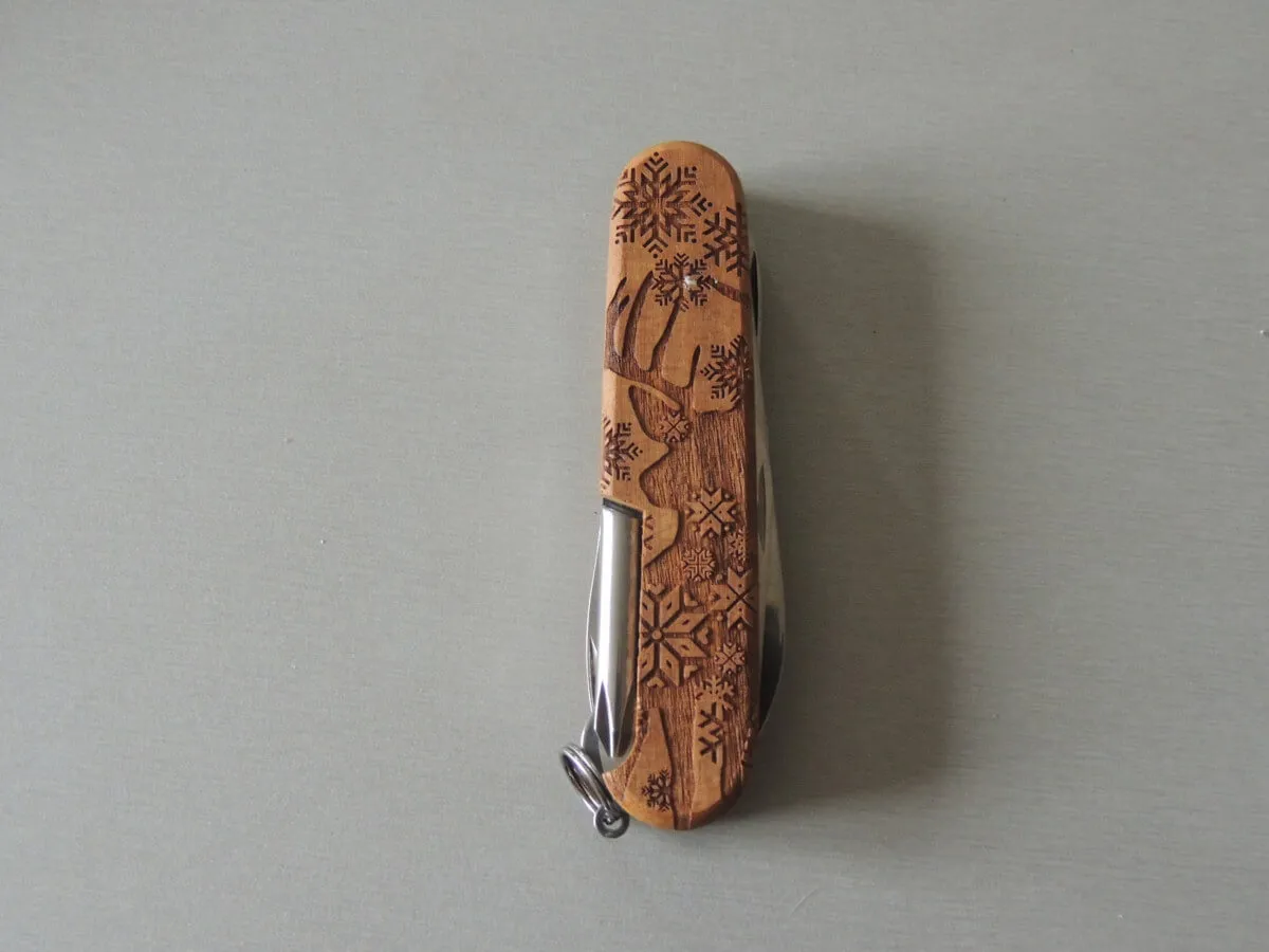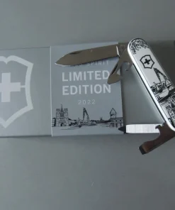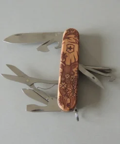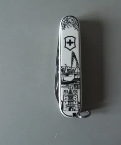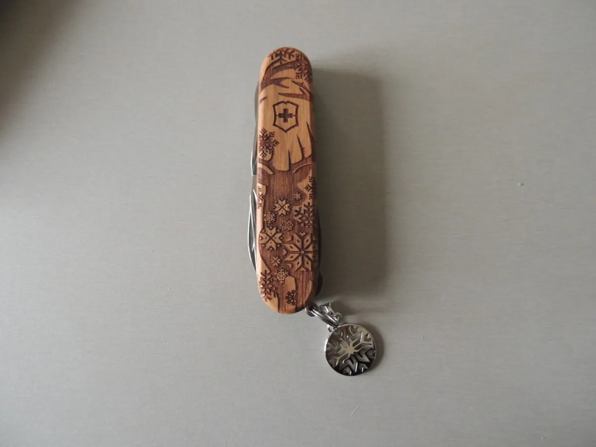 Couteau de poche fabriqué en Suisse avec 12 fonctions et un magnifique charm à attacher au design assorti.