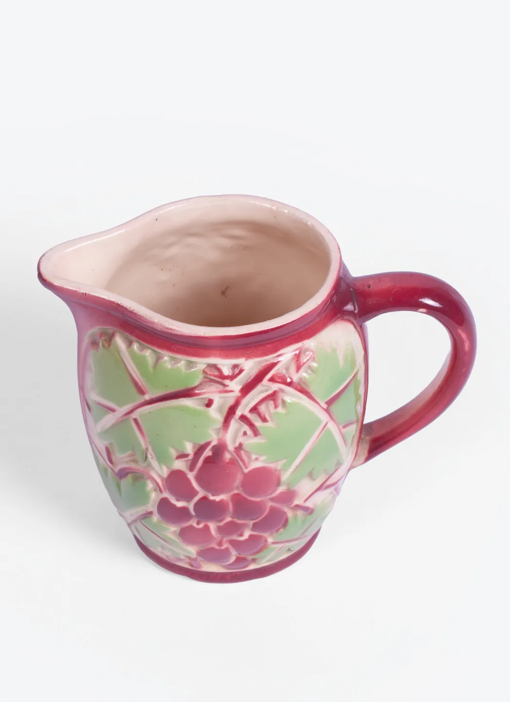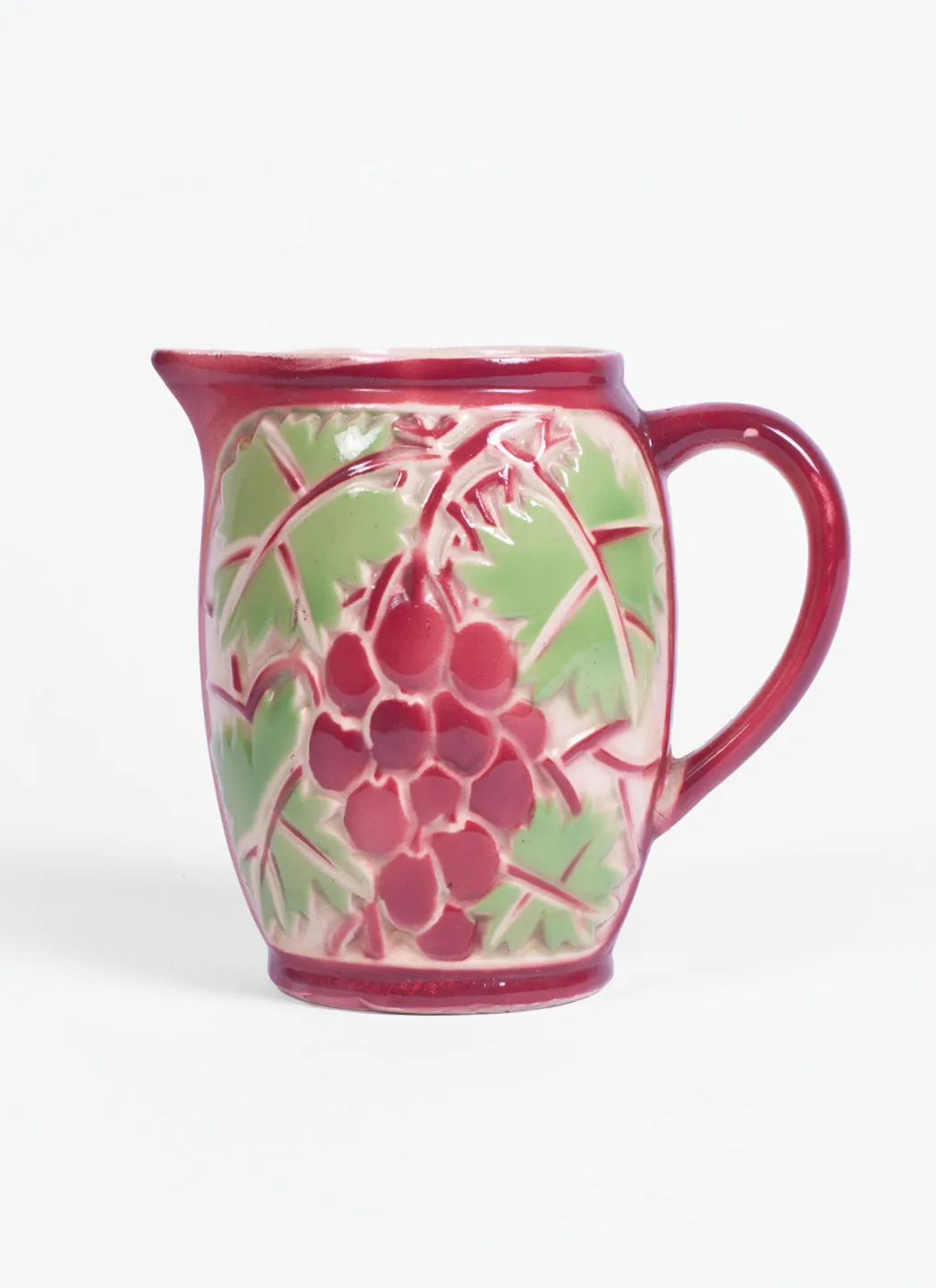 Magnifique broc vintage à motif de raisins violets et de feuilles vertes en excellent état. Parfait pour ajouter un peu de chaleur à n’importe quelle situation de repas.