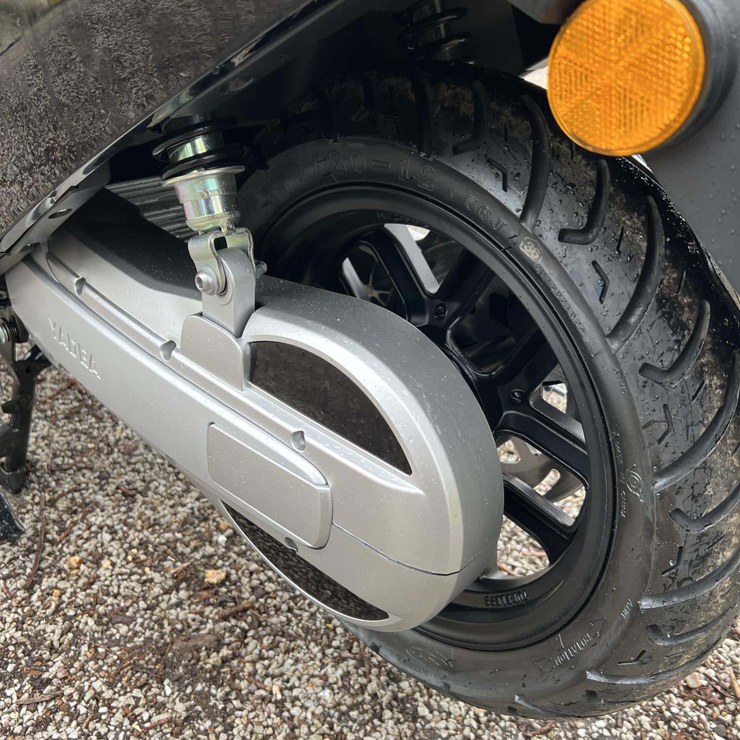 Le moteur électrique du Yadea G5 Pro développe 3 100 Watts en nominal et en crête. Il est installé en position centrale, la transmission s’effectue via une courroie. Ce moteur sait être coupleux et performant. Les accélérations sont agréables : il y a de la pêche. Son constructeur annonce un couple maximal de 67 Nm. Équivalent de 50 cm3 donc accessible sans permis si vous êtes né avant le 1er janvier 1988, la vitesse maximale du Yadea G5 Pro est de 45 km/h. Pour en savoir plus sur les permis de conduire, vous pouvez consulter notre guide.